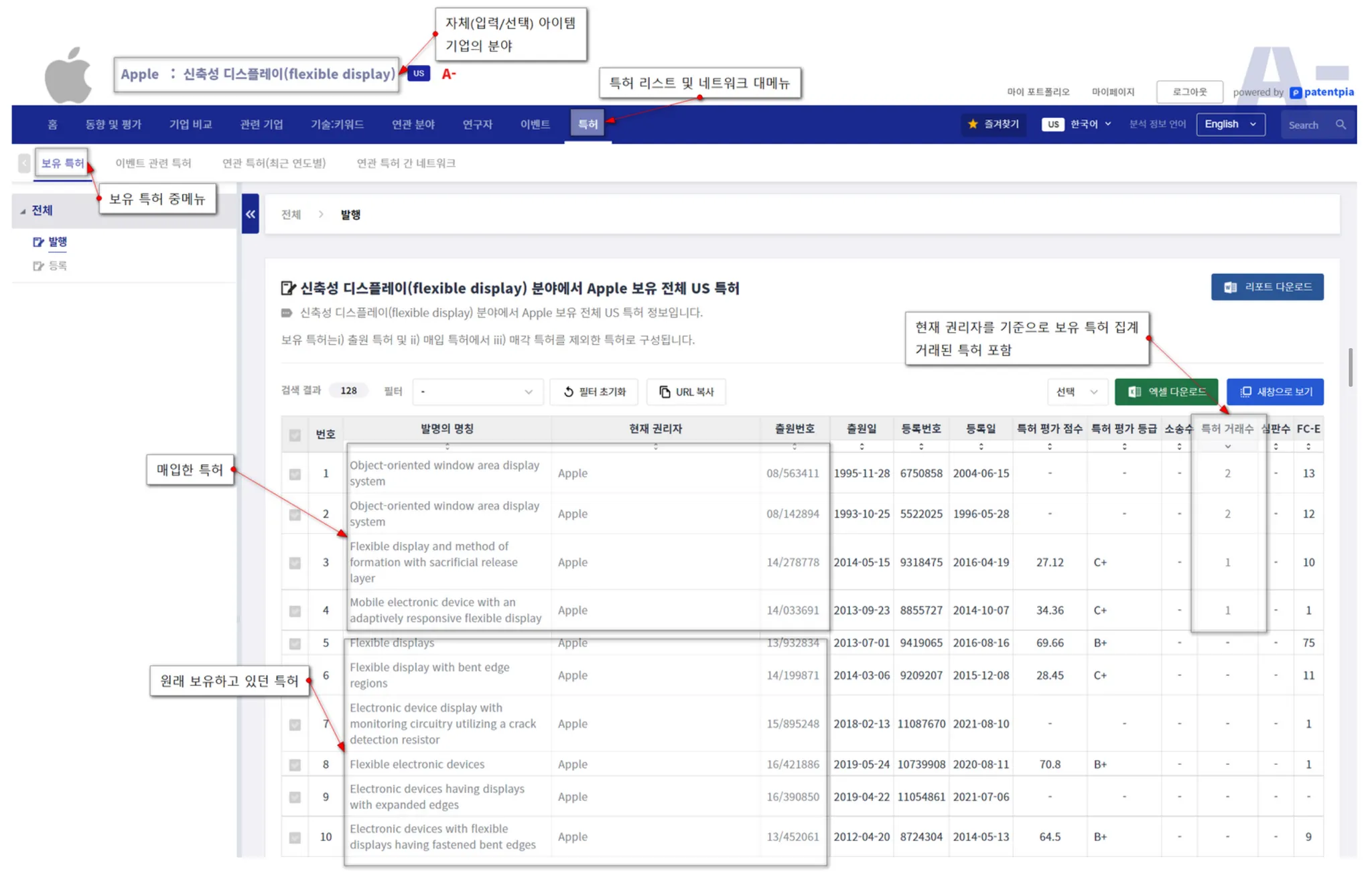 아래 예시는 "Apple"의 flexible display"라는 기업&키워드 아이템에 대한 US 특허 리스트 콘텐츠입니다. 아래 특허 리스트 콘텐츠에는 "Apple"이 "flexible display" 키워드 아이템 분야에서 매입한 특허가 포함되어 있음을 알 수 있습니다. 이와 같이, PatentPia의 보유 특허 리스트 콘텐츠를 현재 권리자를 기준으로 생성됩니다.
