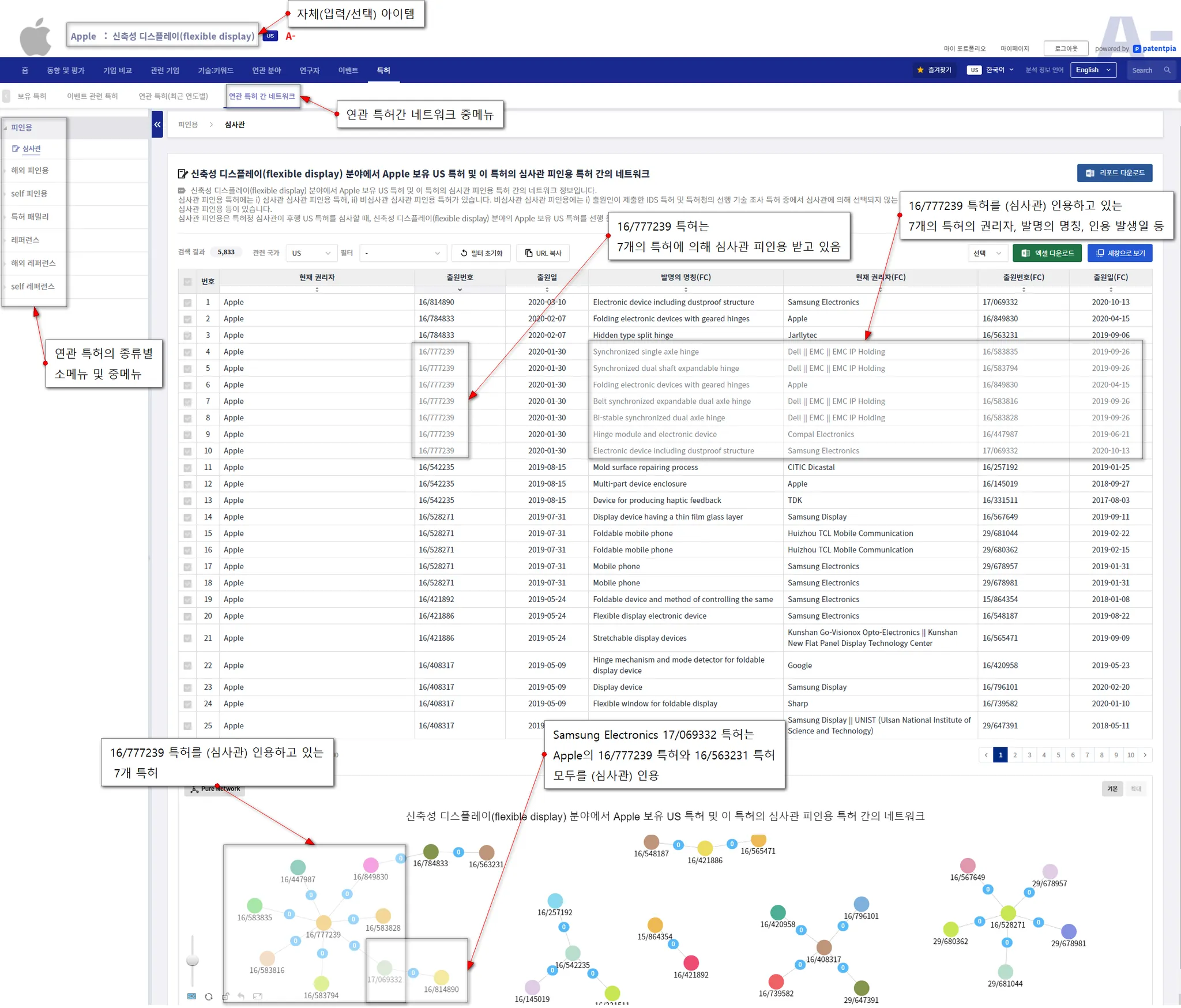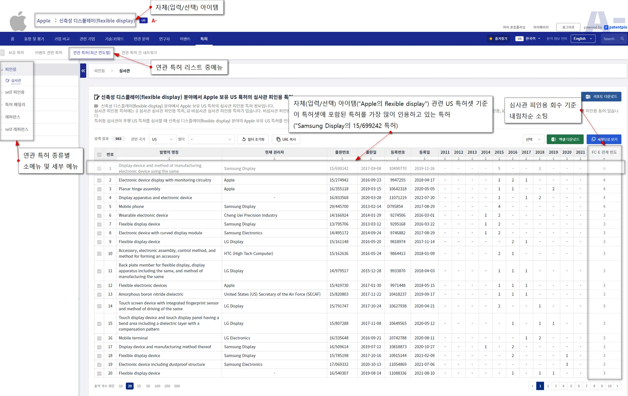 위 예시에서 자체(입력/선택) 아이템("Apple의 flexible display") 관련 US 특허셋 기준으로 이 특허셋에 포함된 특허를 가장 많이 (심사관) 인용하고 있는 특허는 "Samsung Display의 15/699242 특허임을 알 수 있습니다. 물론, 2019~2021 등과 같이 최근 연도에서 내림차순 선택하면 최근 들어 자체(입력/선택) 아이템("Apple의 flexible display") 관련 US 특허셋의 특허를 많이 (심사관) 인용하는 특허 및 그 특허의 권리자 등을 알 수 있습니다.