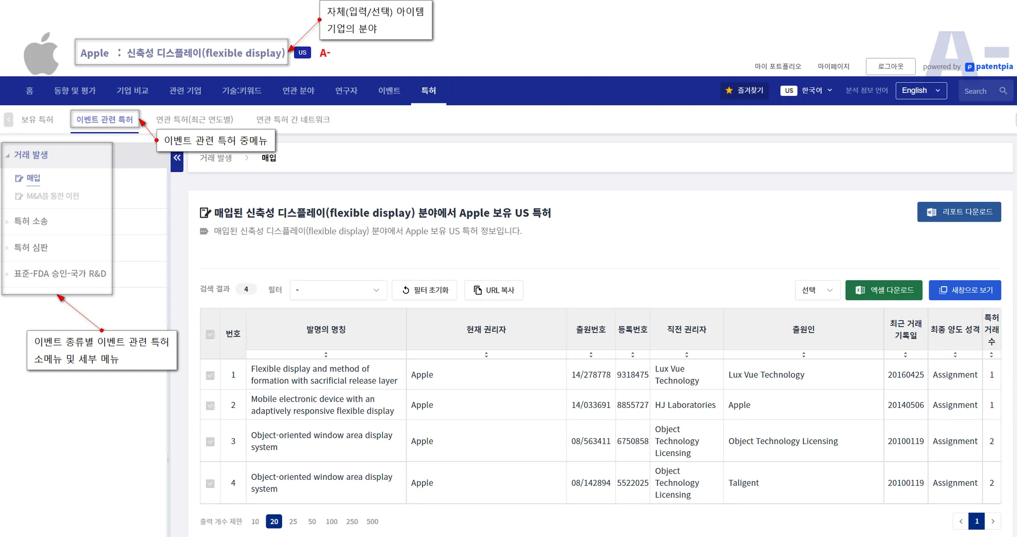 아래 예시는 "Apple"의 flexible display"라는 기업&키워드 아이템에 대한 거래 이벤트와 관련된 매입 US 특허 리스트 콘텐츠입니다. 이벤트 관련 특허 리스트 콘텐츠에는 "Apple"이 "flexible display" 키워드 아이템 분야의 전체 특허 중, "Apple"이 매입한 특허, 즉 이벤트와 관련된 특허만 나타납니다.