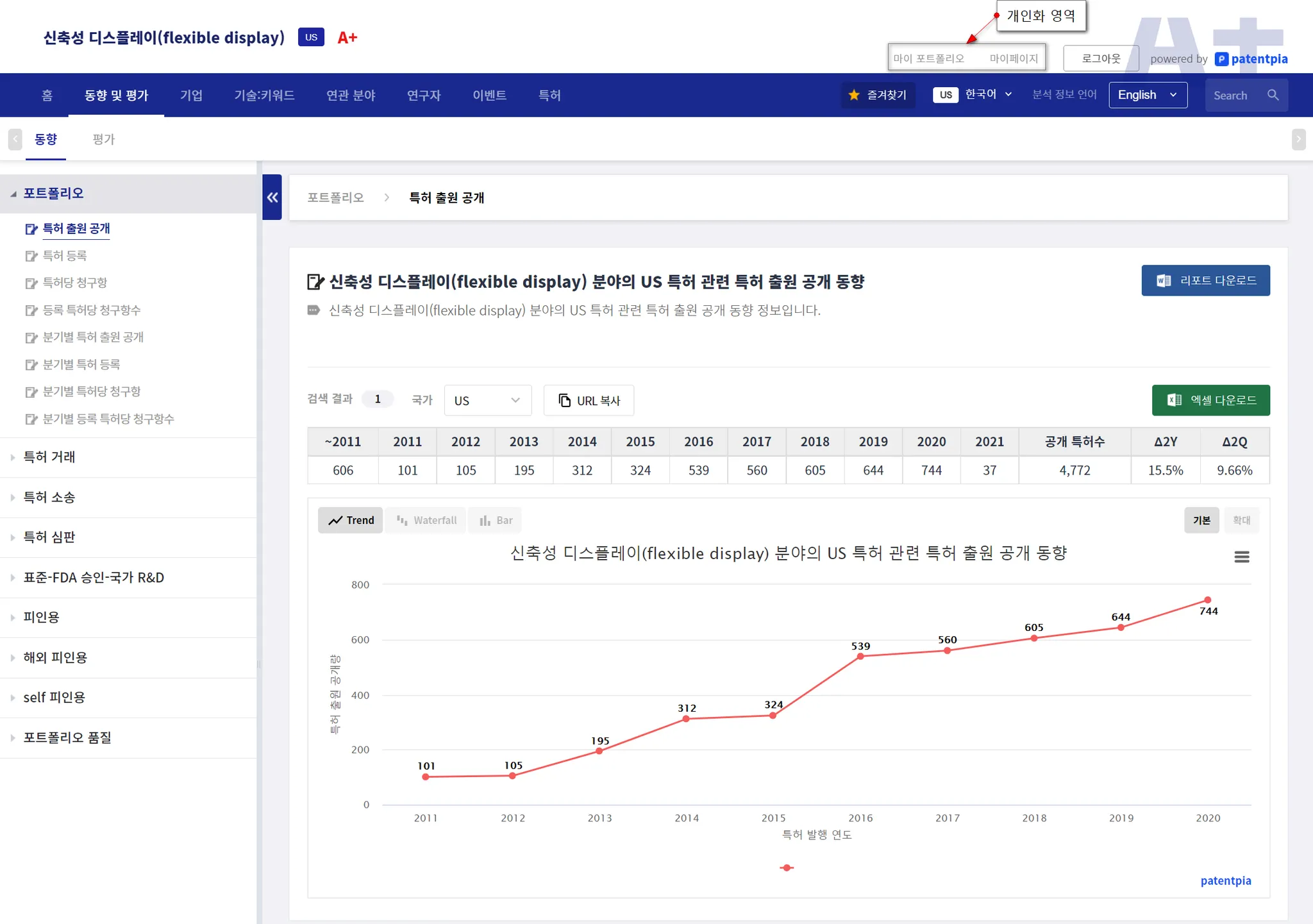 분석 결과 페이지에서도 오른쪽 최상단에 개인화 영역이 있습니다.