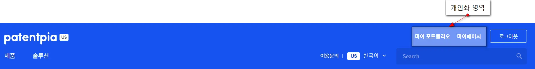 개인화 영역은 사이트의 최상단 오른쪽에 있습니다.