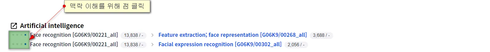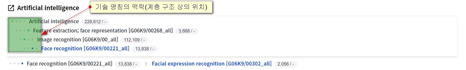 검색 결과로 나타나는 기술 명칭의 맥락(계층, 기술 명칭이 속하는 상위 분류 체계)를 알기 위해서는 "파란색"으로 된 점을 클릭합니다. 동일한 기술 명칭이 다른 맥락 하에서 각각 존재할 수 있기 때문에, 맥락에 맞는 검색 결과를 선택할 필요가 있습니다.