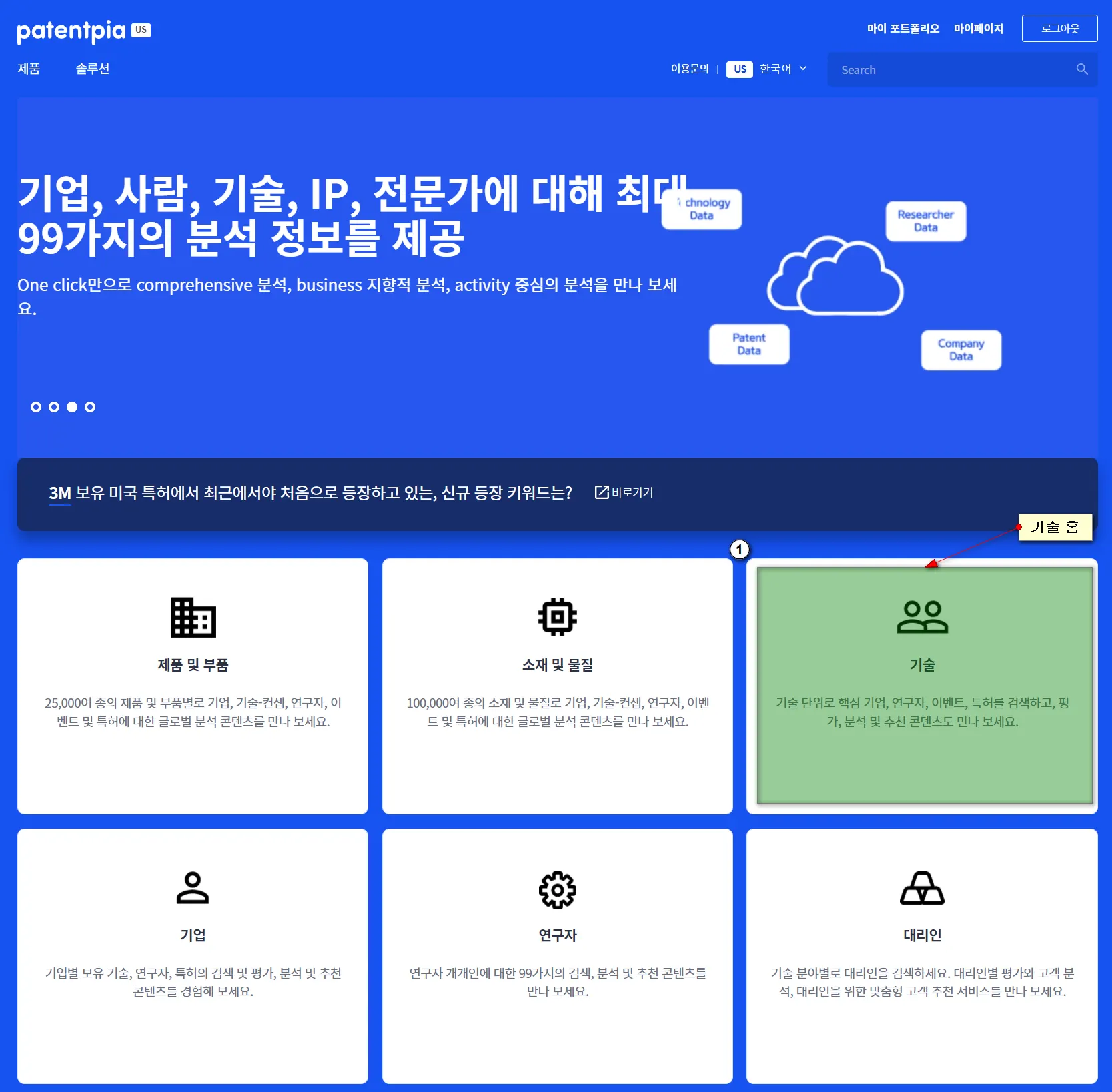 기술 홈은 PatentPia GoldenCompass main 화면에 있습니다.