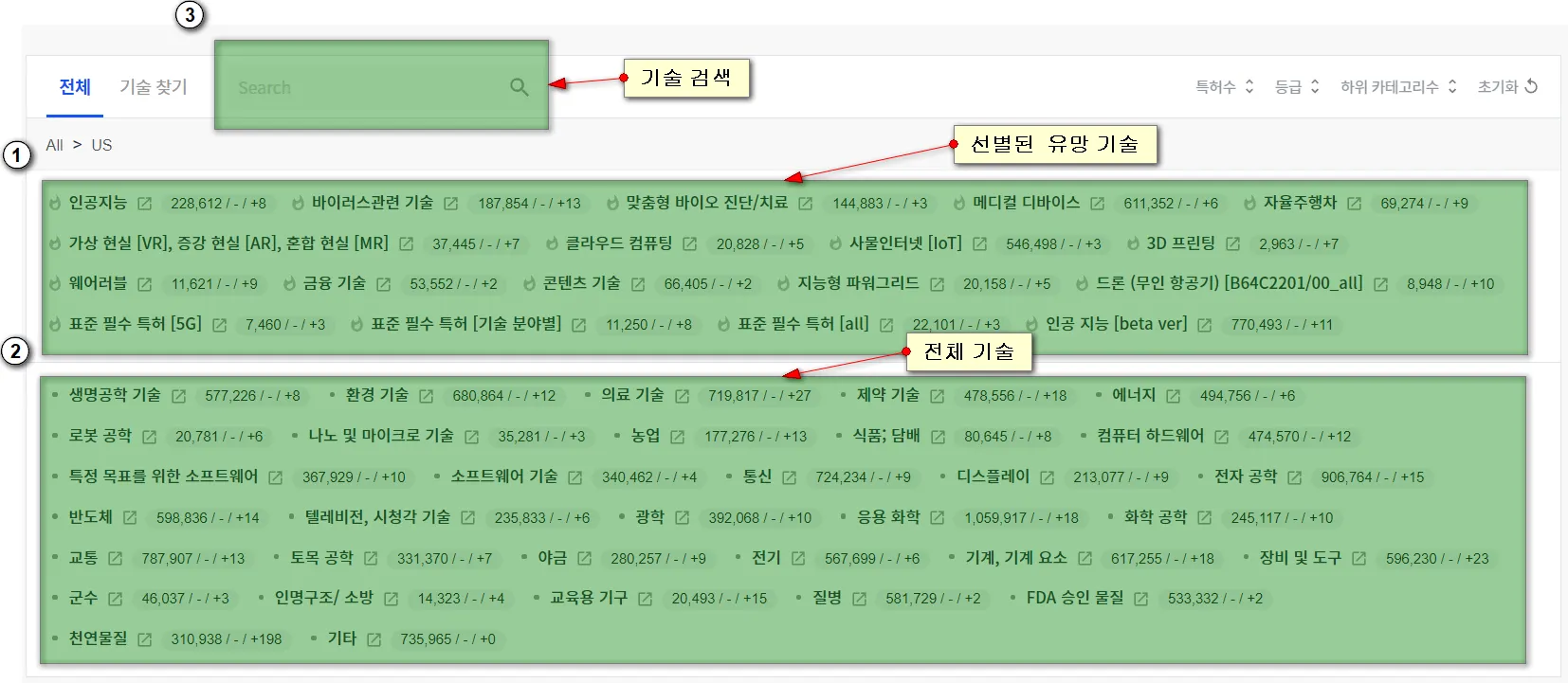 물론, 검색 기능도 제공하고 있습니다. 다만, 검색 기능은 입력할 기술 또는 기술 표현을 알고 있어야 검색어로 입력할 수 있습니다. 브라우징을 통해 기술 분류를 탐색하면, i) 상위 및 하위에 있는 기술도 함께 파악되며, ii) 주변 기술이나 대등한 범주에 있는 다른 다양한 기술도 함께 파악되는 장점이 있습니다.