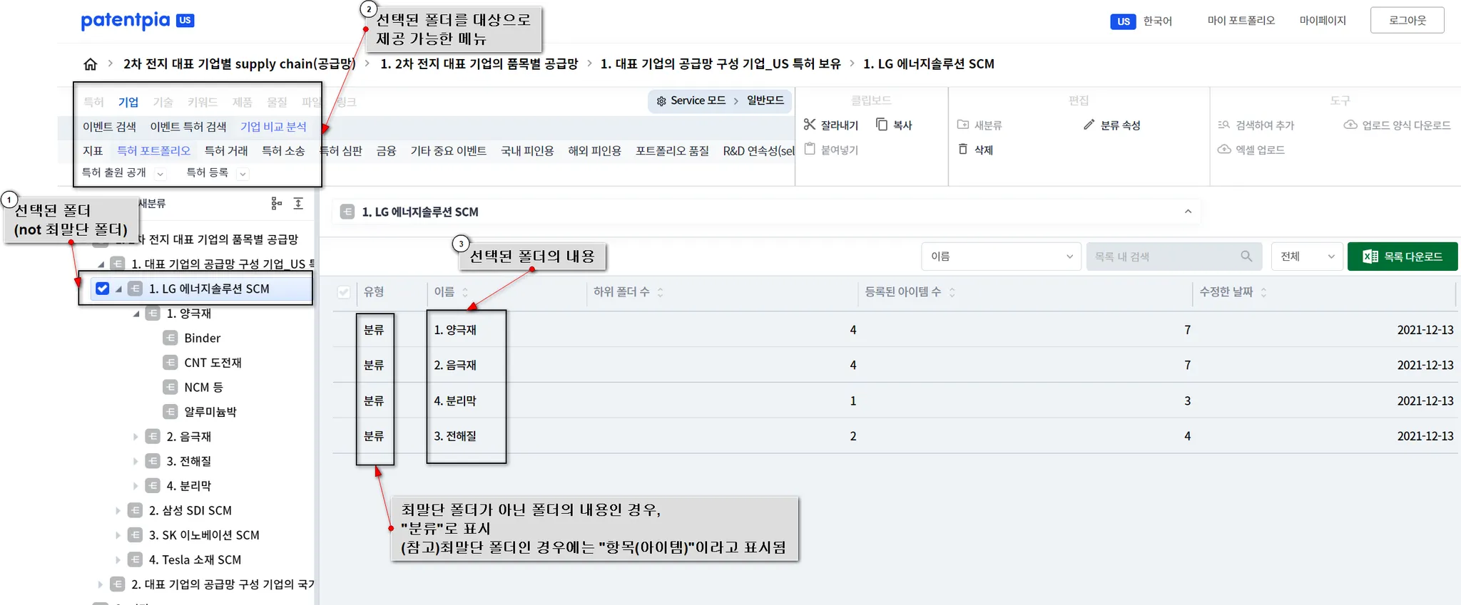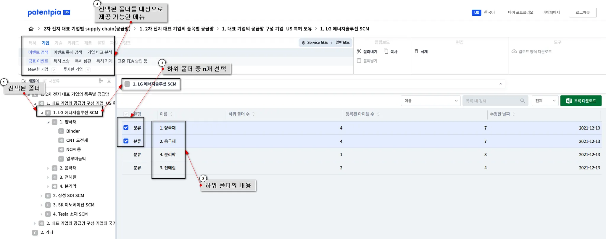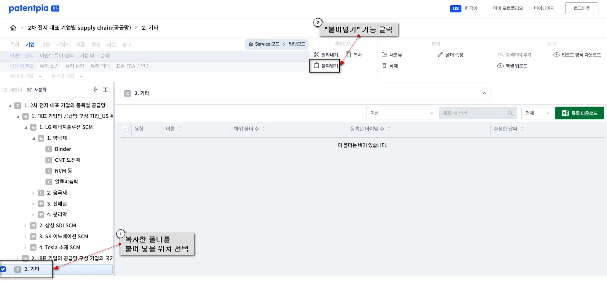 예시적으로, “아이템 등록 (계층형) 폴더 영역”의 특정 폴더(예, “1. LG 에너지솔루션 SCM” )를 복사한 다음, 다른 폴더(예, “2. 기타”)에 붙여 넣어 보겠습니다.