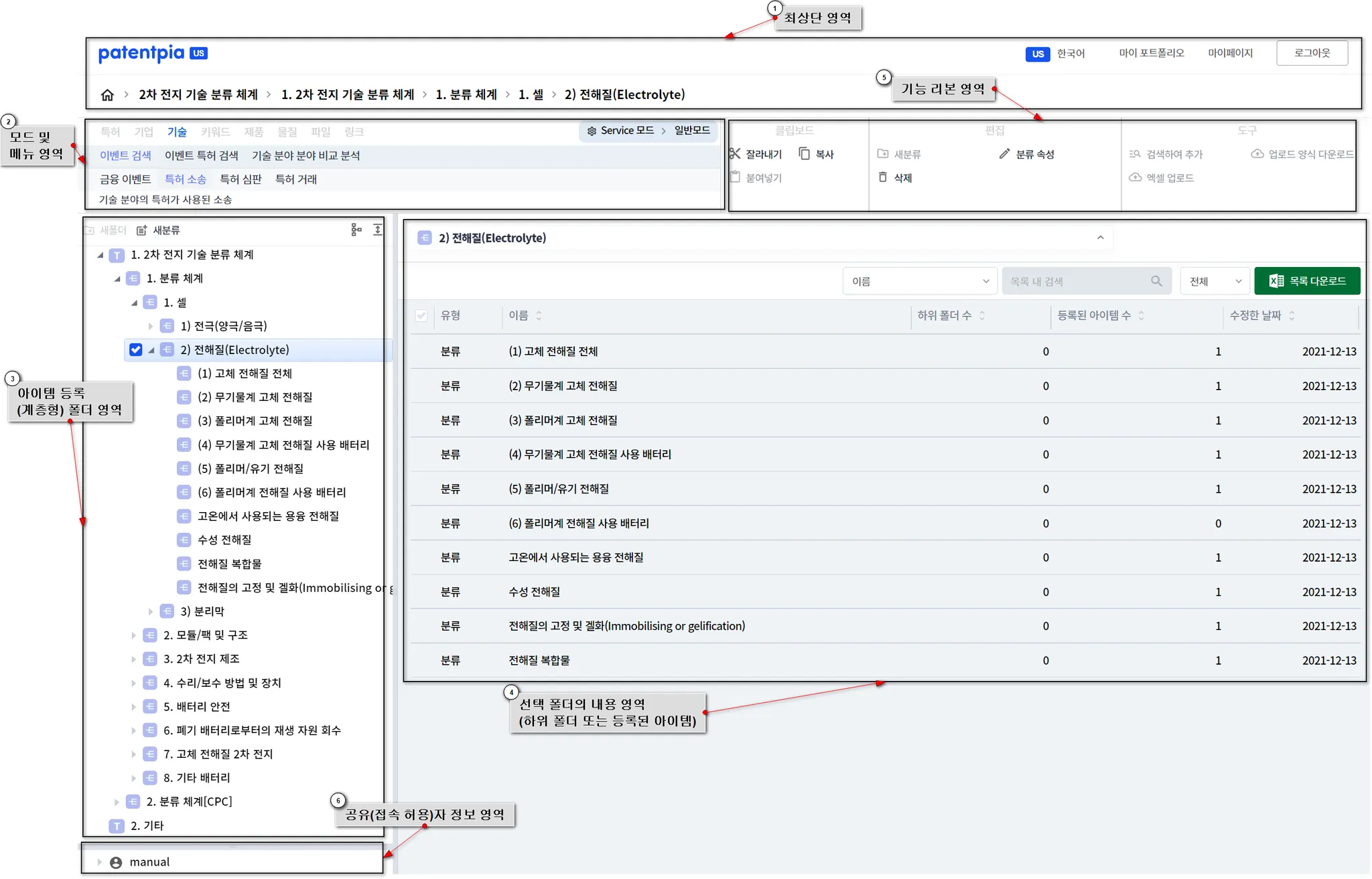 이 중에서, i) 모드 및 메뉴 영역, ii) 아이템 등록 (계층형) 폴더 영역, iii) 선택 폴더의 내용 영역 및 iv) 기능 리본 영역이 중요합니다.