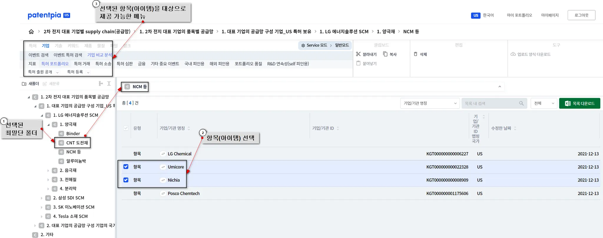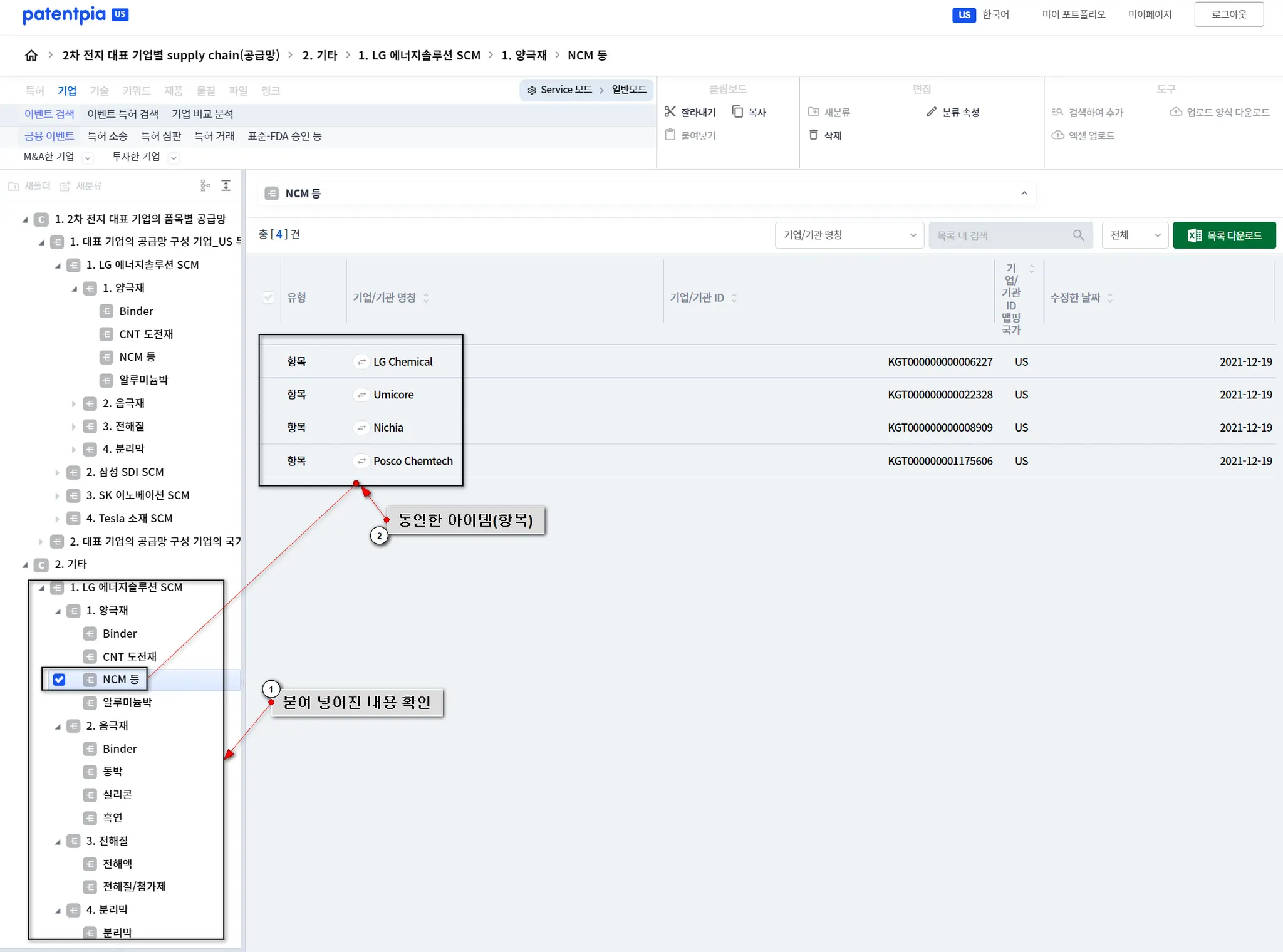 위의 예에서, “NCM 등” 폴더에 대응되는 기업 중 특정 기업 아이템(예, “Posco ChemTech”)을 선택하고, 복사한 다음, 특정한 폴더(예, “흑연”)을 선택하고 붙여 넣기를 실행할 수 있습니다.