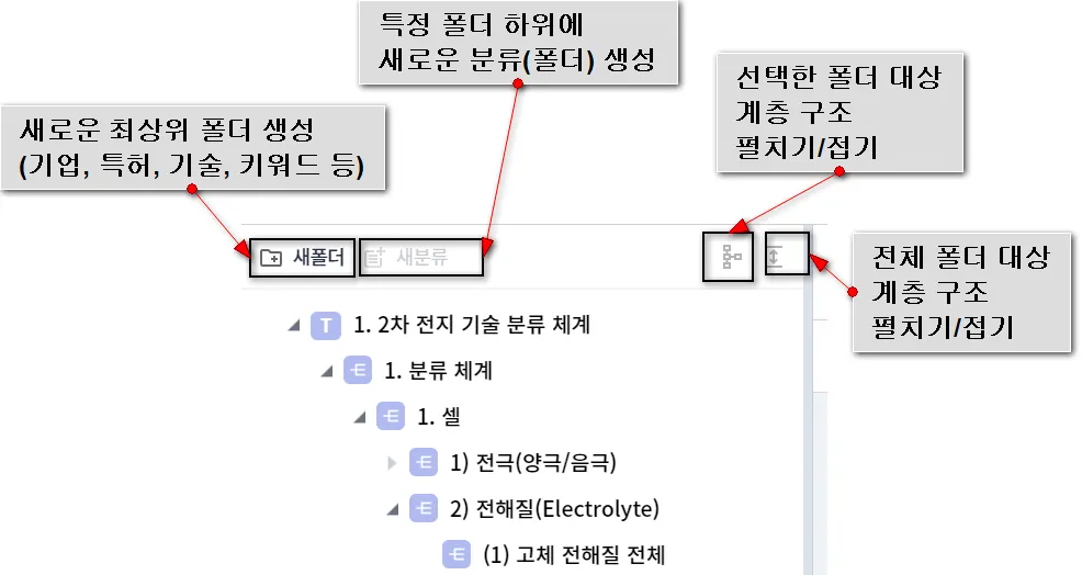 폴더 생성과 관련된 것에는 i) 새로운 최상위 폴더의 생성 및 ii) 특정 폴더 하위에 새로운 분류(폴더)의 생성이 있습니다.