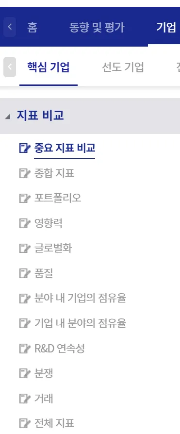 중요 지표는 종합 지표 중 중요한 것만 선별한 것입니다. 전체 지표는 종합 지표 각각의 항목에 대해 i) 10년 연평균 증감율(CAGR_10Y) , ii) 5년 연평균 증감율(CAGR_5Y), iii) 최근 2년간 증감율, iv) 최근 2분기간 증감율을 추가한 것입니다. 주제별 지표에는 i) 포트폴리오, ii) 영향력(피인용), iii) 글로벌화, iv) 품질, v) R&D 연속성(self 레퍼런스/피인용), vi) 분쟁(소송/심판), vii) 거래, viii) 거절 등이 있습니다.