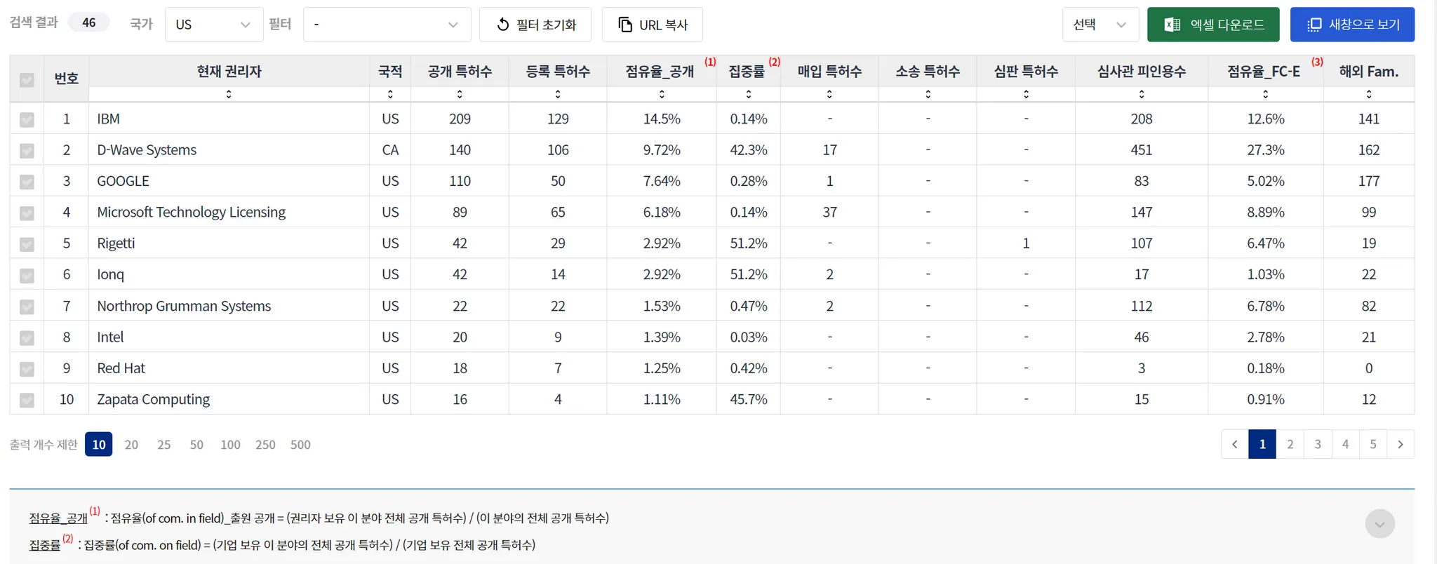 점유율_공개 | 특정 국가 기준, 특정 대상(기술 분야 등)의 모든 출원-공개 특허 중에서, 특정 권리자(또는 발명자)가 보유(발명)하고 있는 특허의 비율 | 현재 권리자 보유 기준 | 특허 포트폴리오 점유율(share) |