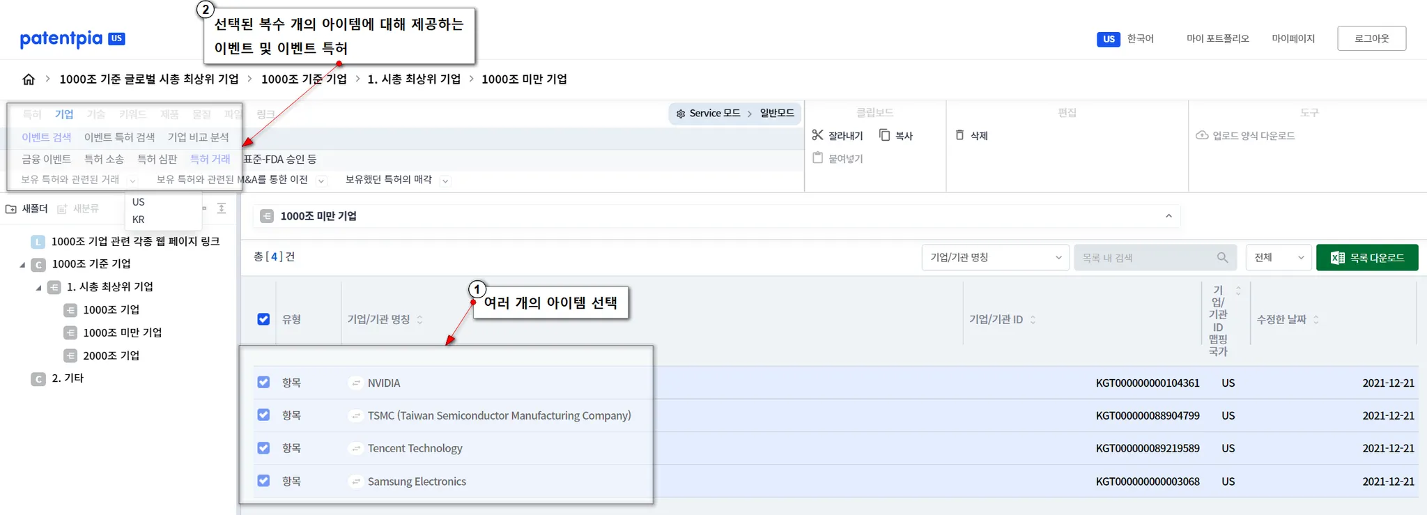My Platform의 폴더 내용 영역에서 아이템을 여러 개 선택(예, Nvidia, TMSC, Tencent Technology, Samsung Electronics)를 선택하고, 검색 메뉴로 “이벤트 검색” → “특허 거래” → “보유 특허와 관련된 거래”을 클릭합니다. 이어, 거래가 발생한 특허가 등록되어 있는 국가(특허청)을 선택합니다.