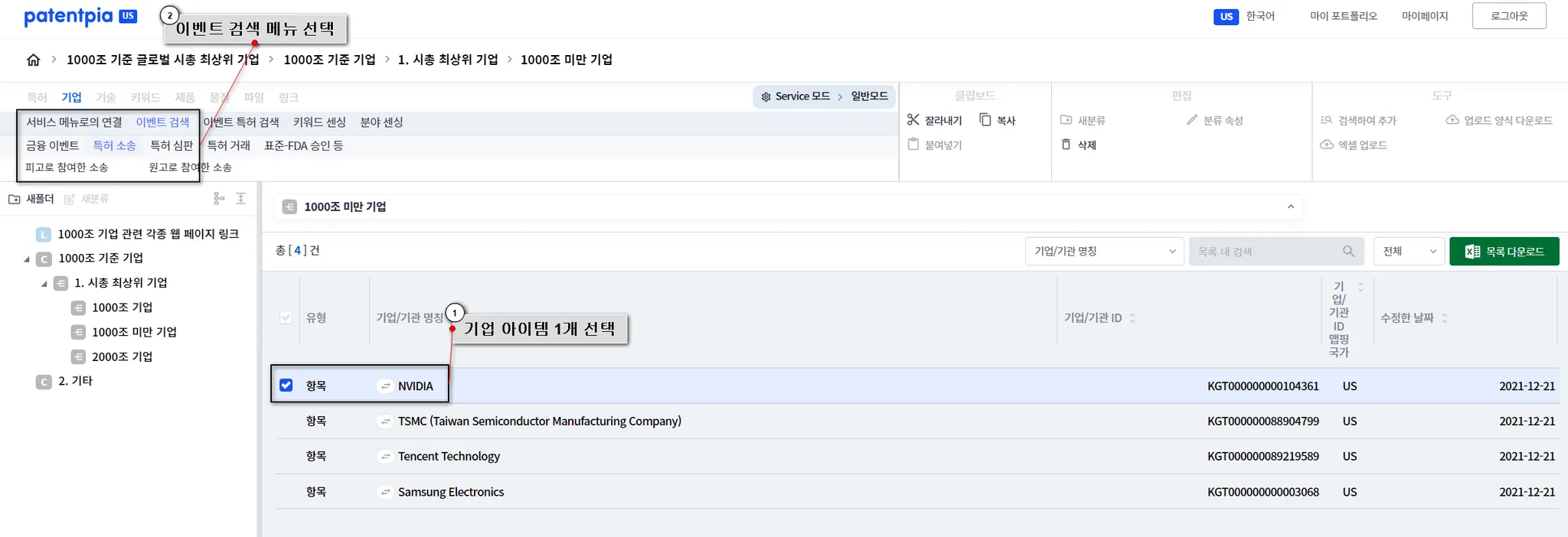 My Platform의 폴더 내용 영역에서 아이템을 1개 선택(예, Nvidia)를 선택하고, 검색 메뉴로 “이벤트 특허 검색” → “소송 특허” → “피고 소송에 사용된 특허”를 클릭합니다.