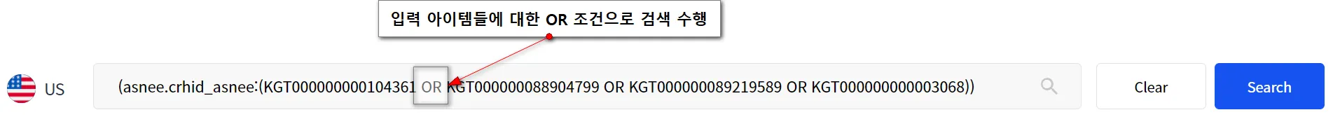 (참고) “결과 내 재검색 UI”를 클릭하면, 선택된 4개 기업 아이템에 대한 기업 ID가 OR 조건으로 검색되고 있음을 알 수 있습니다.