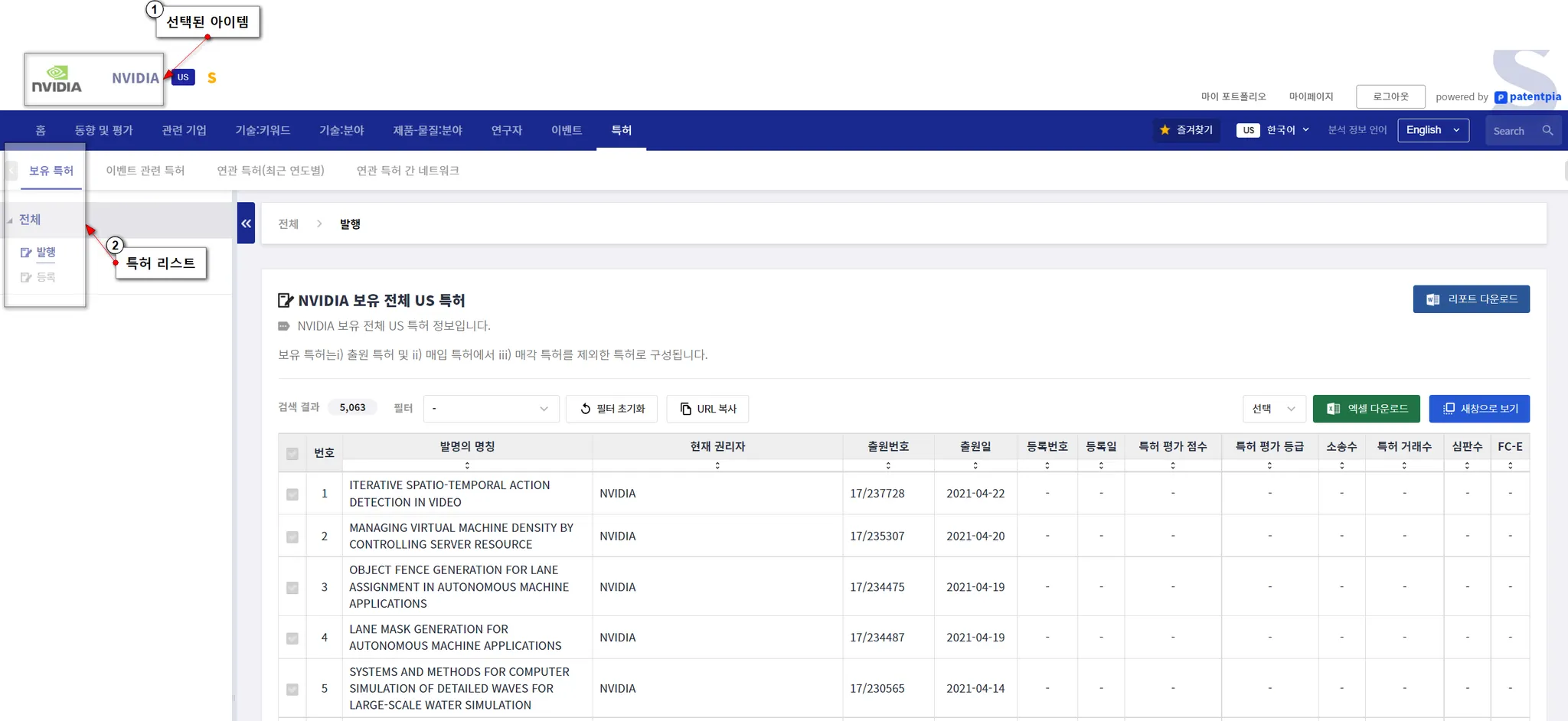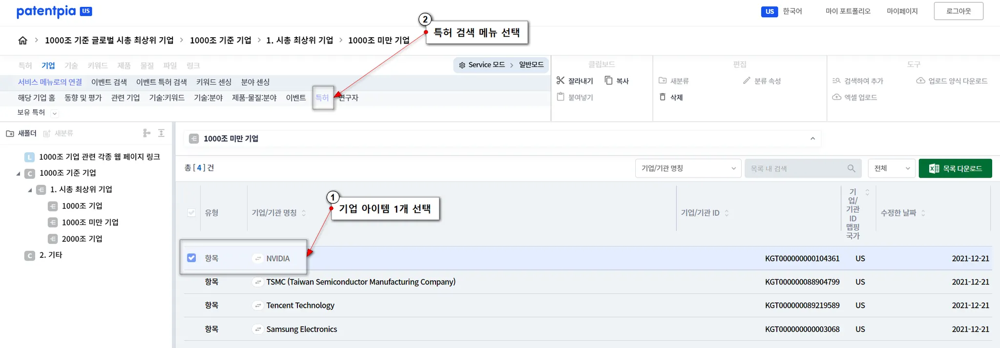 My Platform의 폴더 내용 영역에서 아이템을 1개 선택(예, Nvidia)를 선택하고, 검색 메뉴로 “서비스 메뉴로의 연결” → “특허” → “보유 특허”를 클릭합니다.