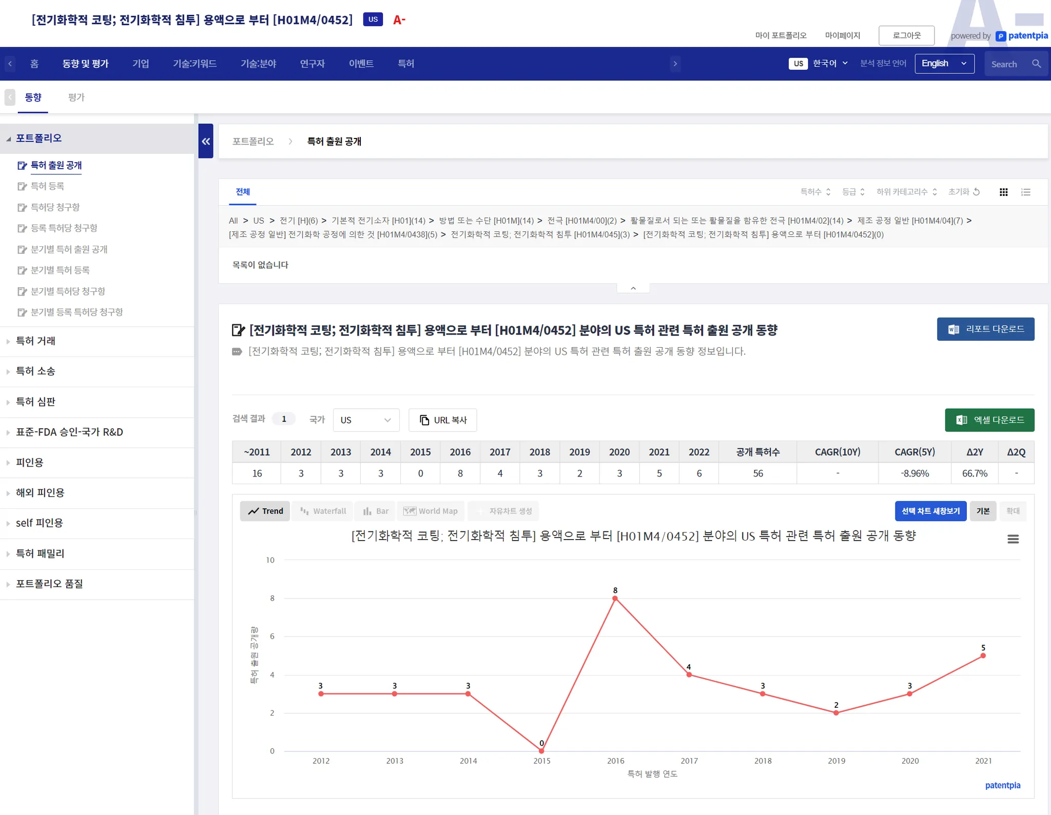 아래 예시는 CPC H01M10/54[Reclaiming serviceable parts of wast accumulators(폐배터리로부터의 자원 회수)]에 대한 PatentPia GoldenCompass의 분석 콘텐츠 예시함.
