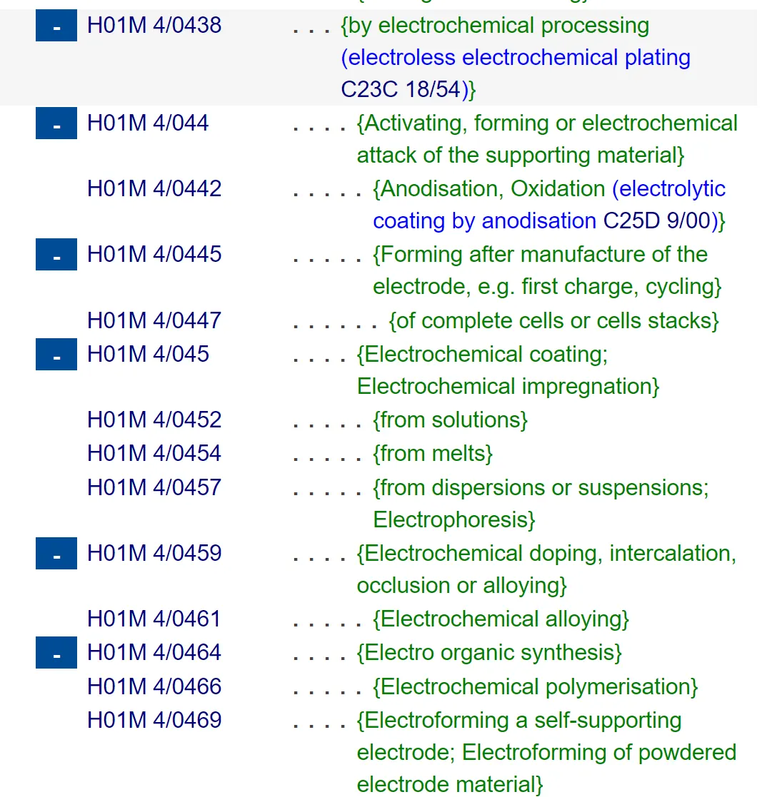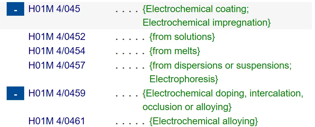 CPC 계층 구조 상, 3 dot subgroup depth를 가지는 예시 CPC H01M4/0438 직하위에는, 4 dot subgroup depth를 가지는 H01M4/044, H01M4/045, H01M4/0459, H01M4/0464, H01M4/0469가 있습니다. 이들 각각에는 몇개씩의 5 dot subgroup depth를 하위 특허 분류들이 있습니다.