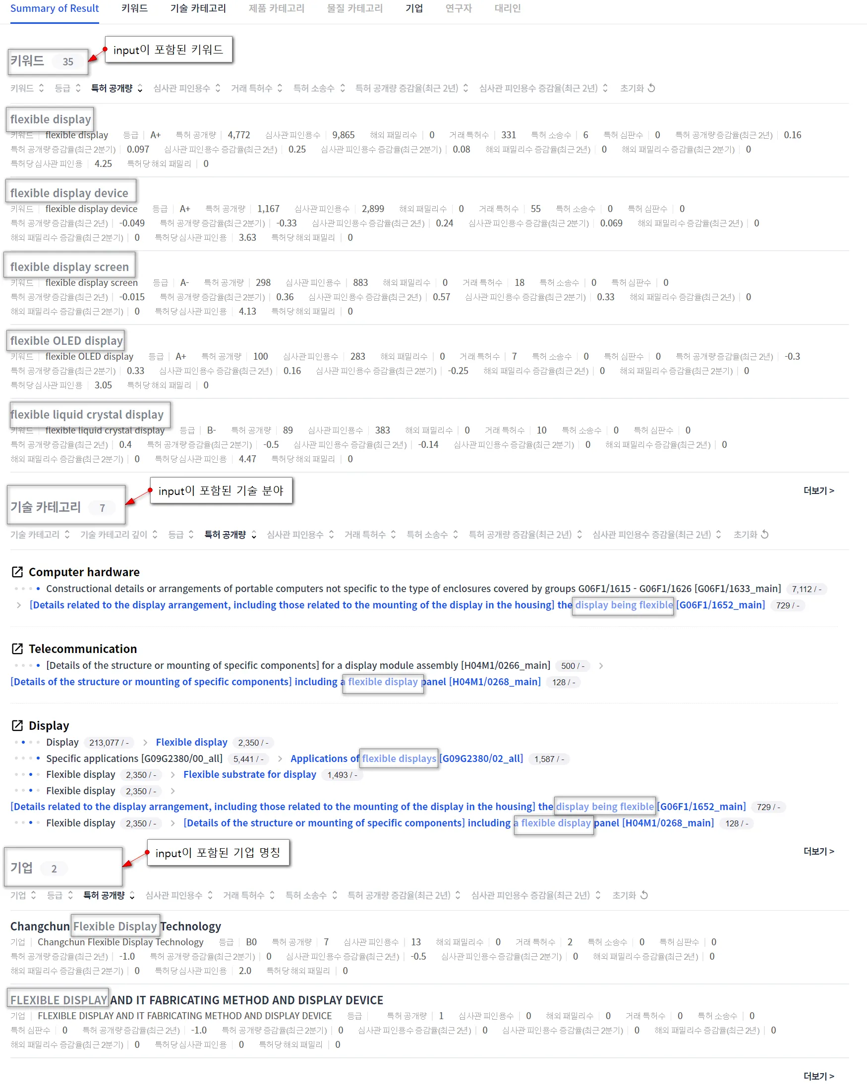 "flexible display"이란 표현이 포함된 다양한 종류(기업, 분류, 키워드 등)의 검색 결과가 생성됩니다.