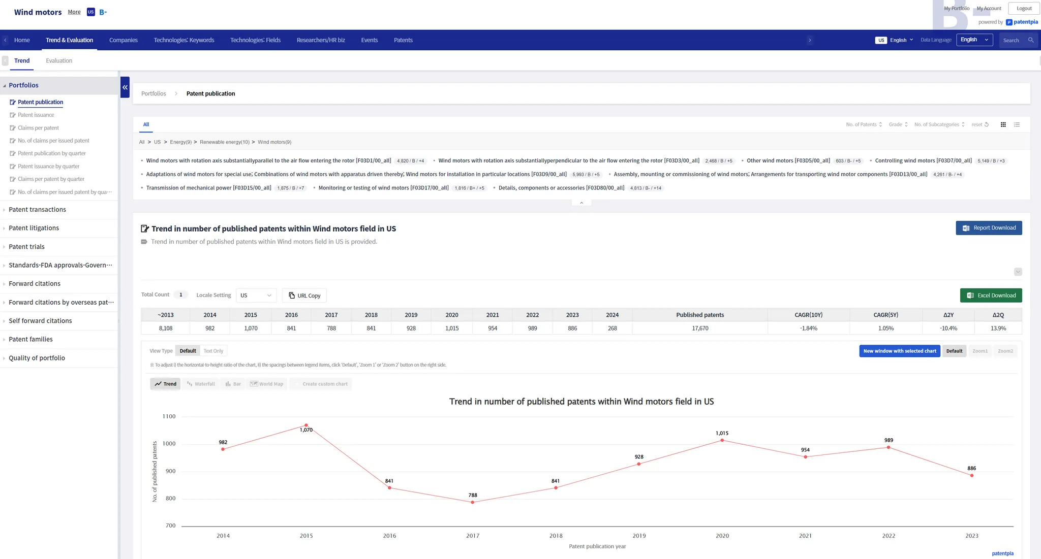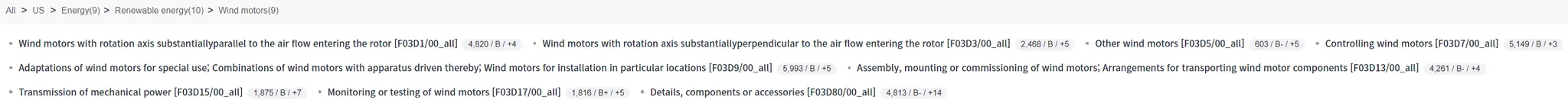 As an example, we can see that the technology category of Wind motors has all of its lower members composed of CPCs.