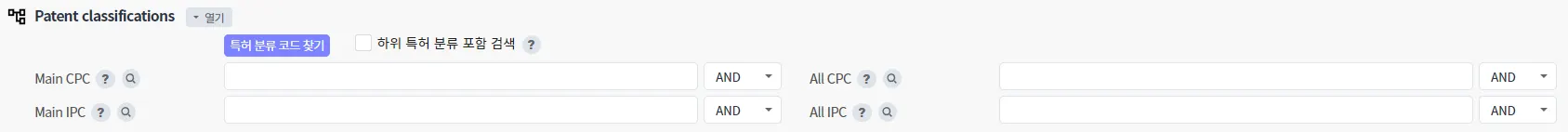 When entering a CPC as a search term, if you enter a CPC code in the Main CPC field, only patents containing the entered CPC in the main patent classification will be searched. If you enter the CPC code in All CPC, patents with the CPC entered in the sub patent classification will also be searched.