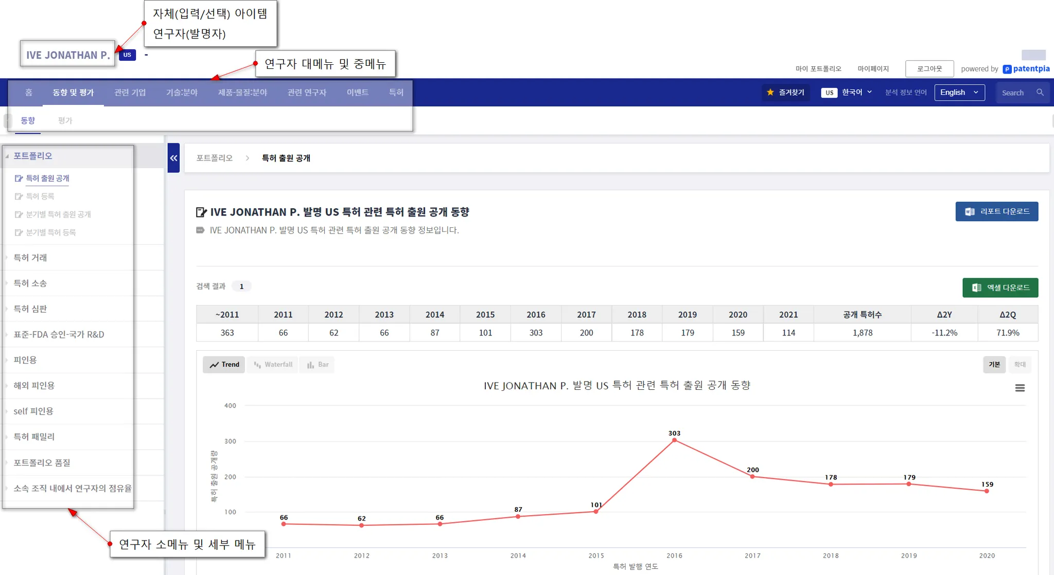 복수 개 연구자군에 속하는 연구자 간의 비교 분석 콘텐츠에는 i) 지표, ii) 특허 포트폴리오, iii) 영향력, iv) 충실성, v) 특허 품질, vi) 이벤트 등이 있습니다.