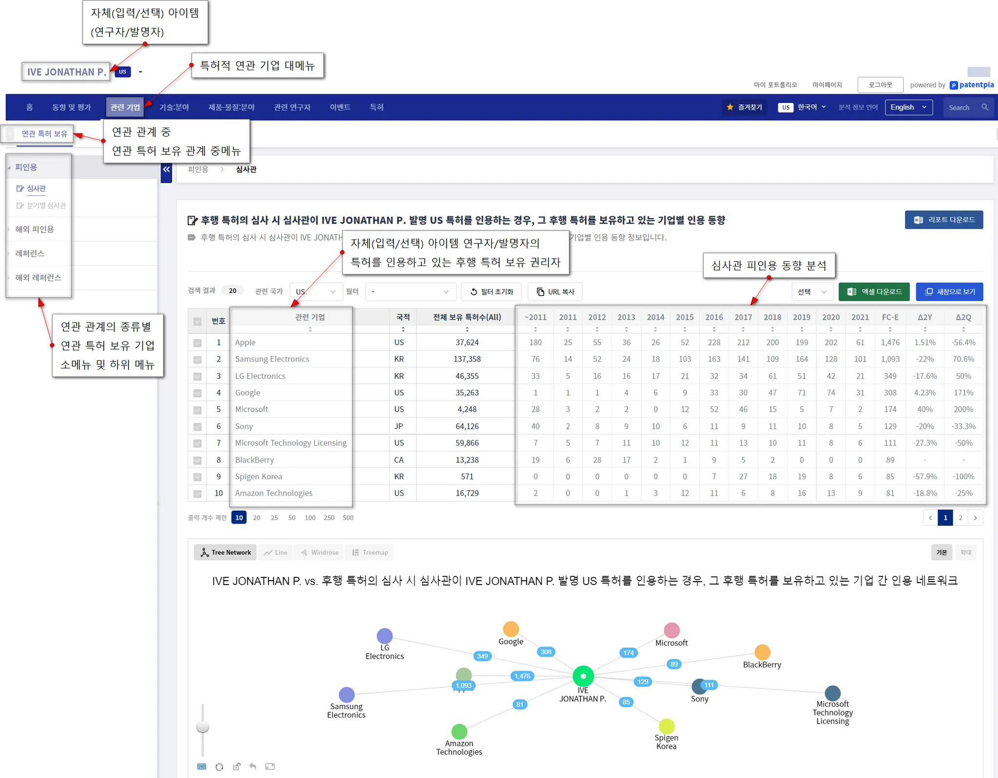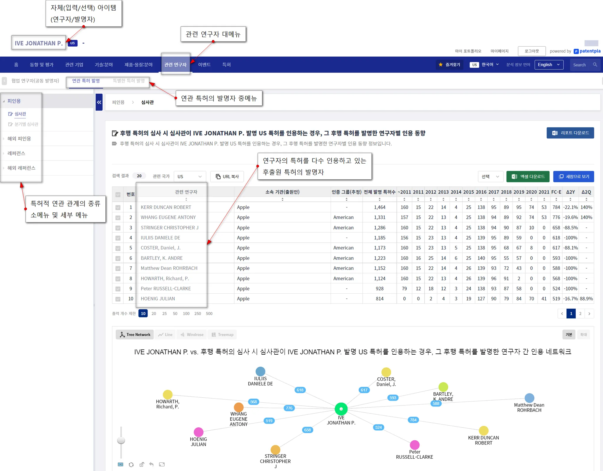 아래 예시는 특정 연구자(발명자)의 특허를 다수 인용하고 있는 후행 특허의 발명자에 대한 분석 콘텐츠입니다.