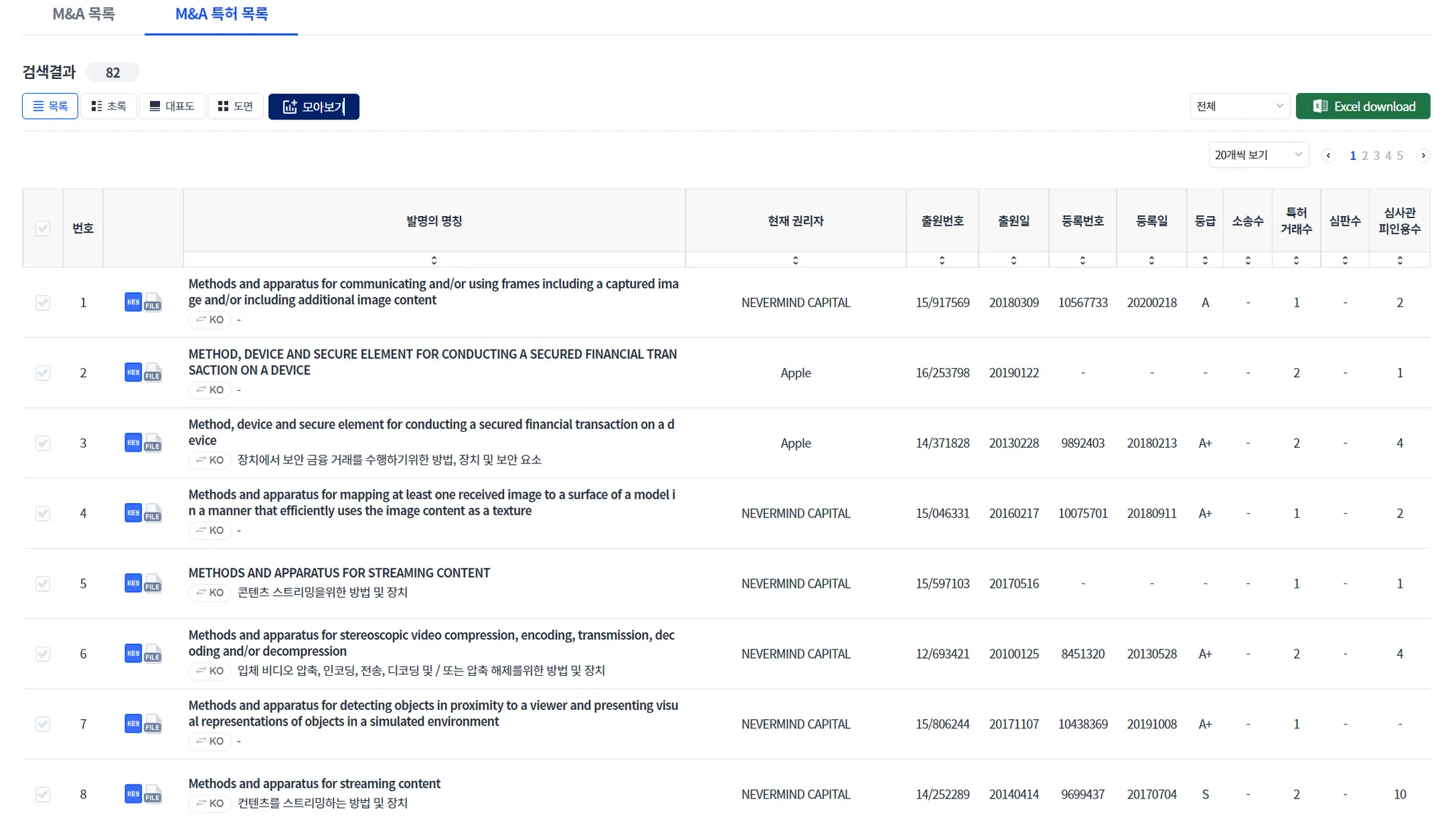 “M&A 특허 목록”을 클릭하면, 검색된 M&A의 피인수 기업(acquiree)이 출원한 특허가 출력됩니다. 피인수 기업이 출원한 특허를 현재 소유하고 있는 권리자(“현재 권리자”)는 출원인이 아닐 수 있습니다.