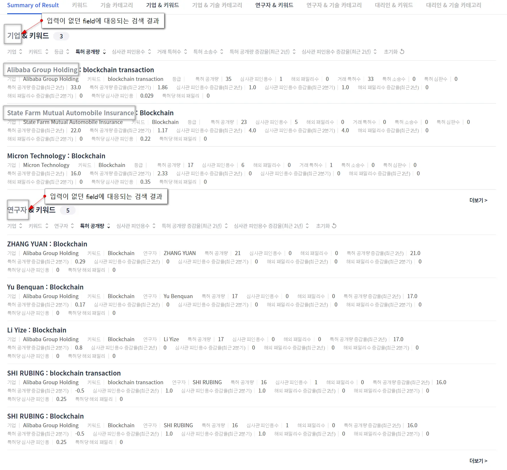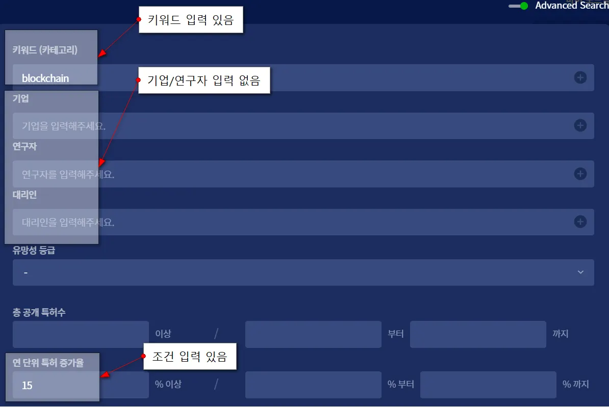 키워드에 "blockchain"을 넣고, 기업/연구자 등에는 어떠한 검색어도 넣지 않고, 검색 조건으로 "연 단위 특허 증가율 15% 이상"을 넣고 검색합니다.