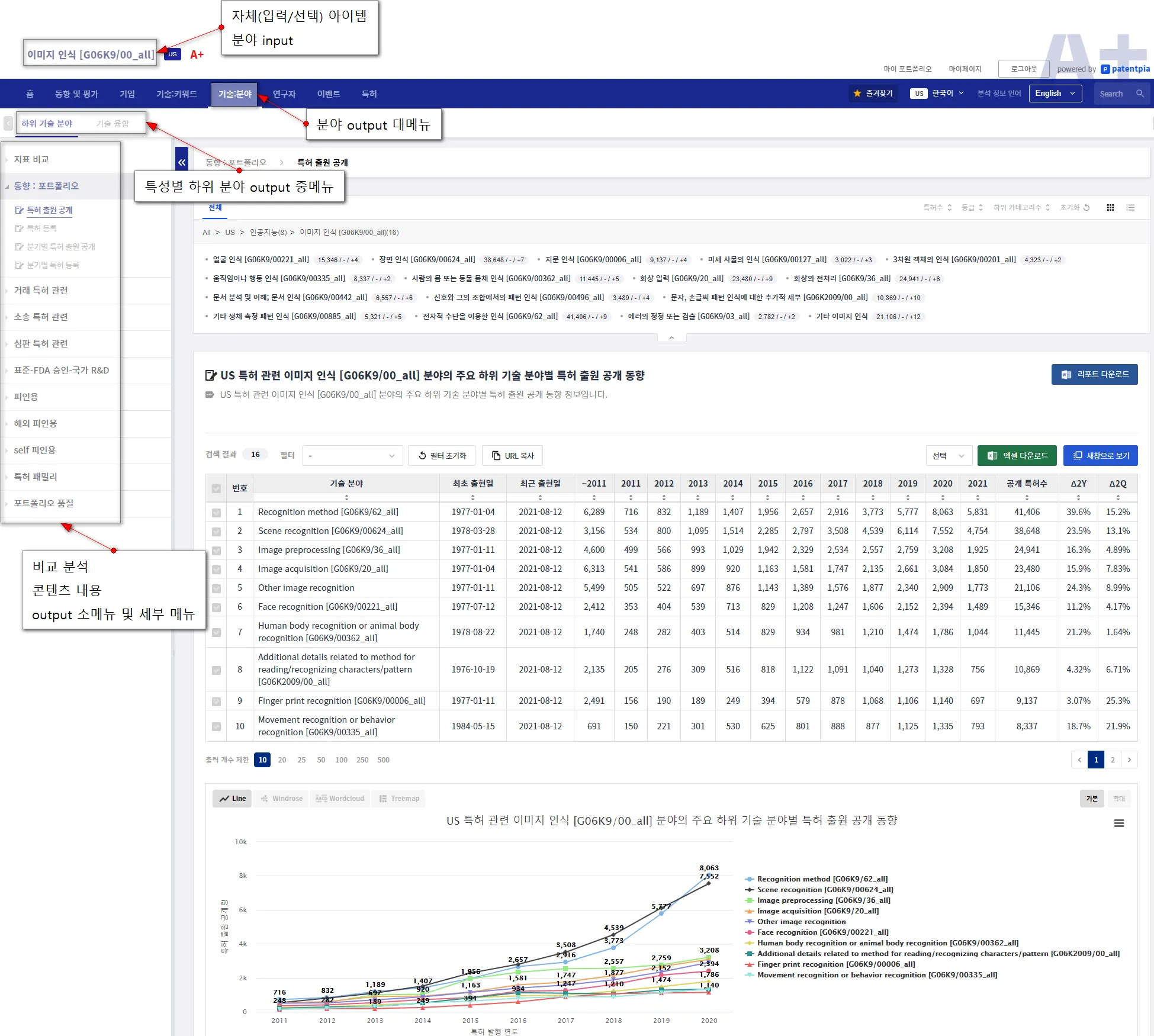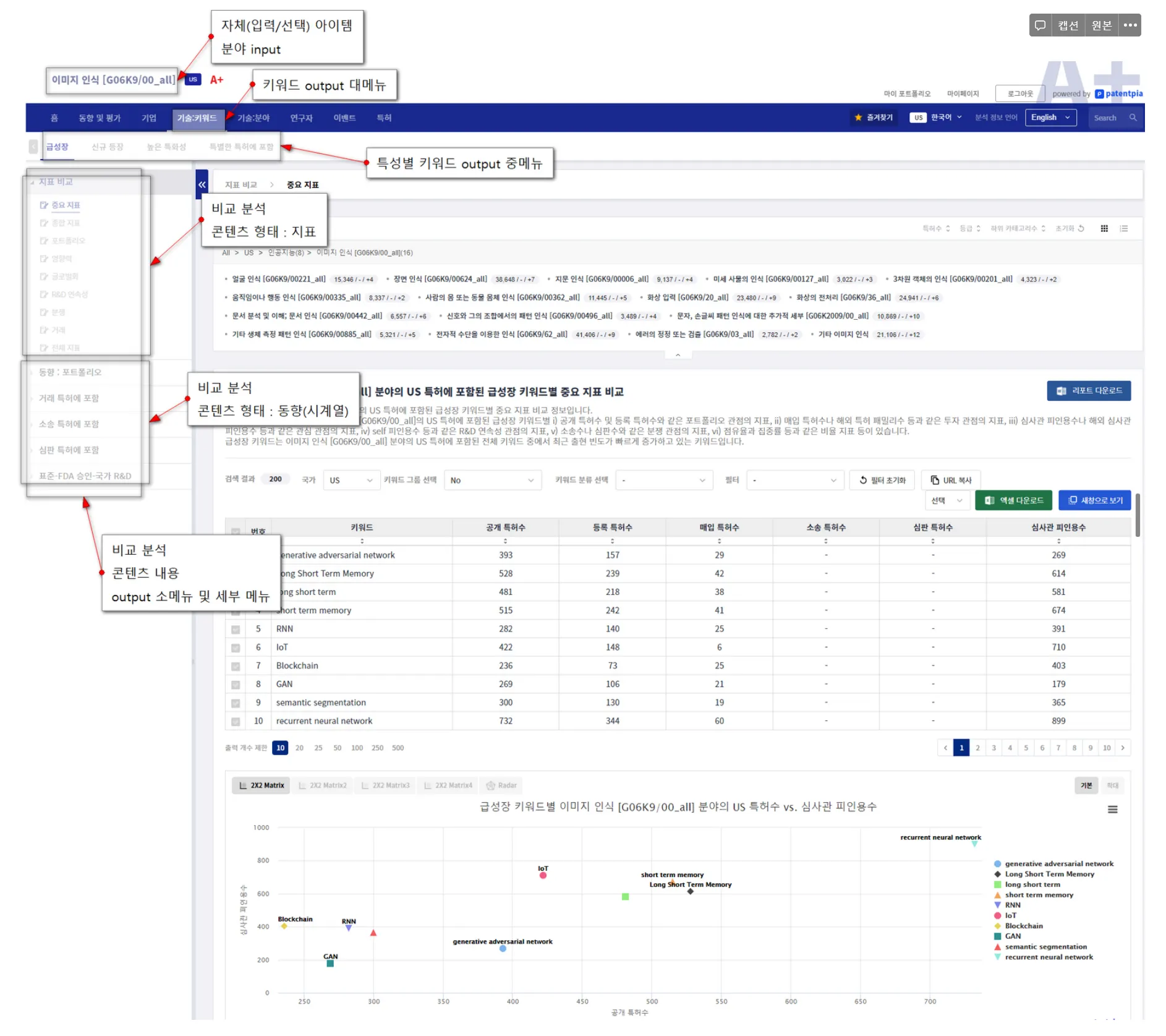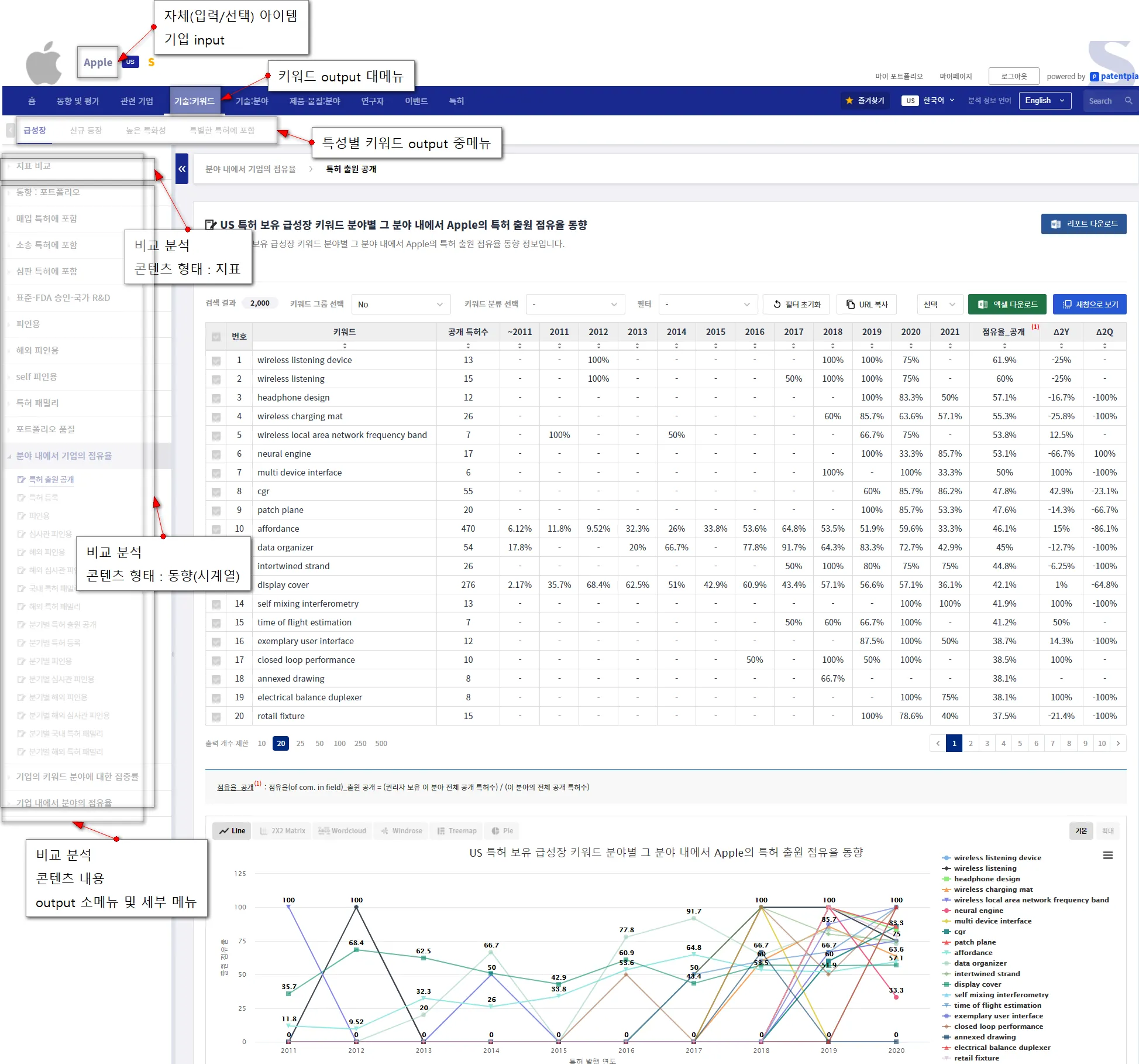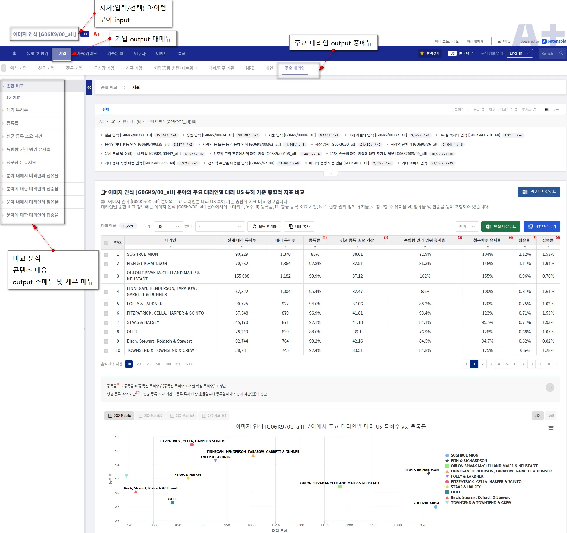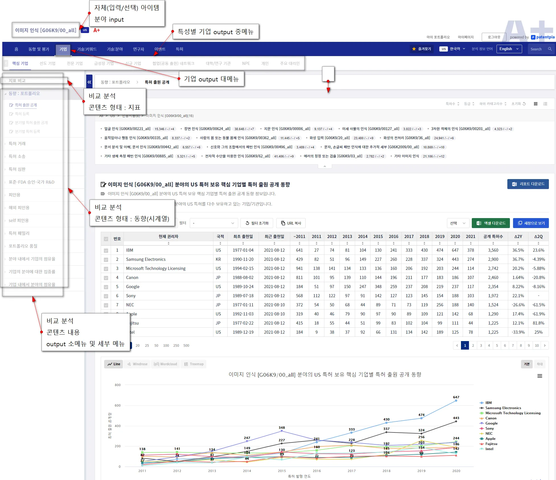 비교 분석 콘텐츠 주제에는 i) 포트폴리오, ii) 영향력, iii) 글로벌화, iv) 품질, v) 점유율 vi) R&D 연속성, vii) 특허 거래(매입), viii) 소송, vx) 심판, x) 표준/FDA 승인/국가 R&D 등이 있습니다.