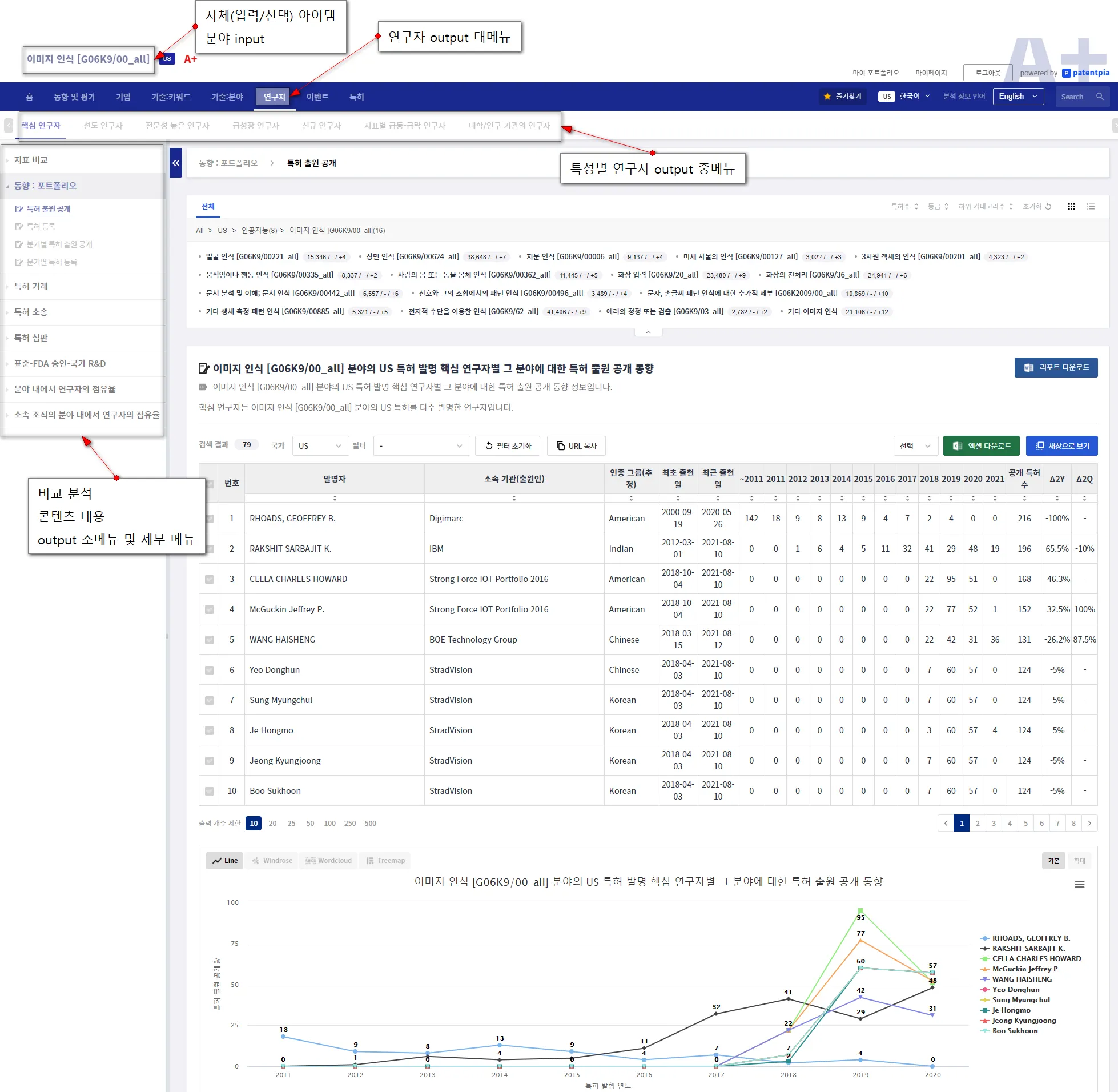 GoldenCompass는 연구자 아이템이 입력/선택되었을 때, 메뉴 클릭만으로 다양한 비교 분석 콘텐츠를 제공해 줍니다. 연구자 아이템에 대한 비교 분석 콘텐츠에는 i) 그 연구자가 발명한 특허에 포함된 특성별 키워드 비교 콘텐츠, ii) 그 연구자가 발명한 특허와 관련된 특성별 분야 비교 콘텐츠 등이 있습니다.