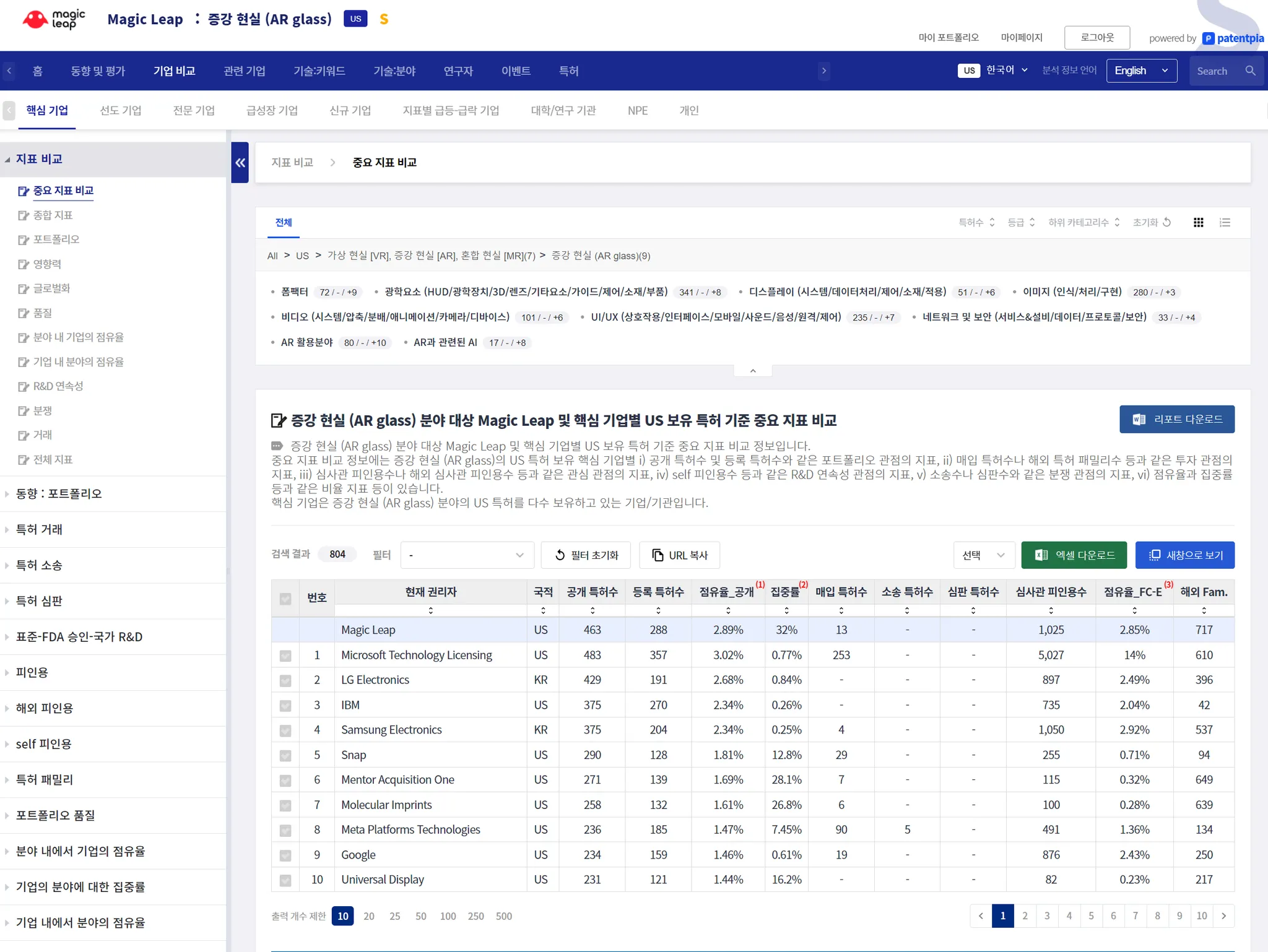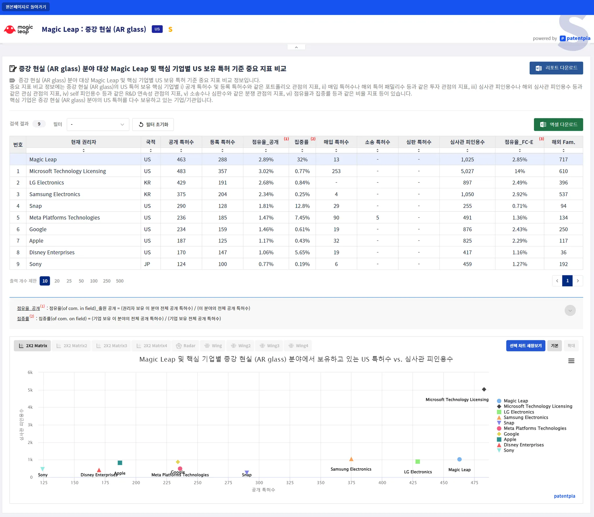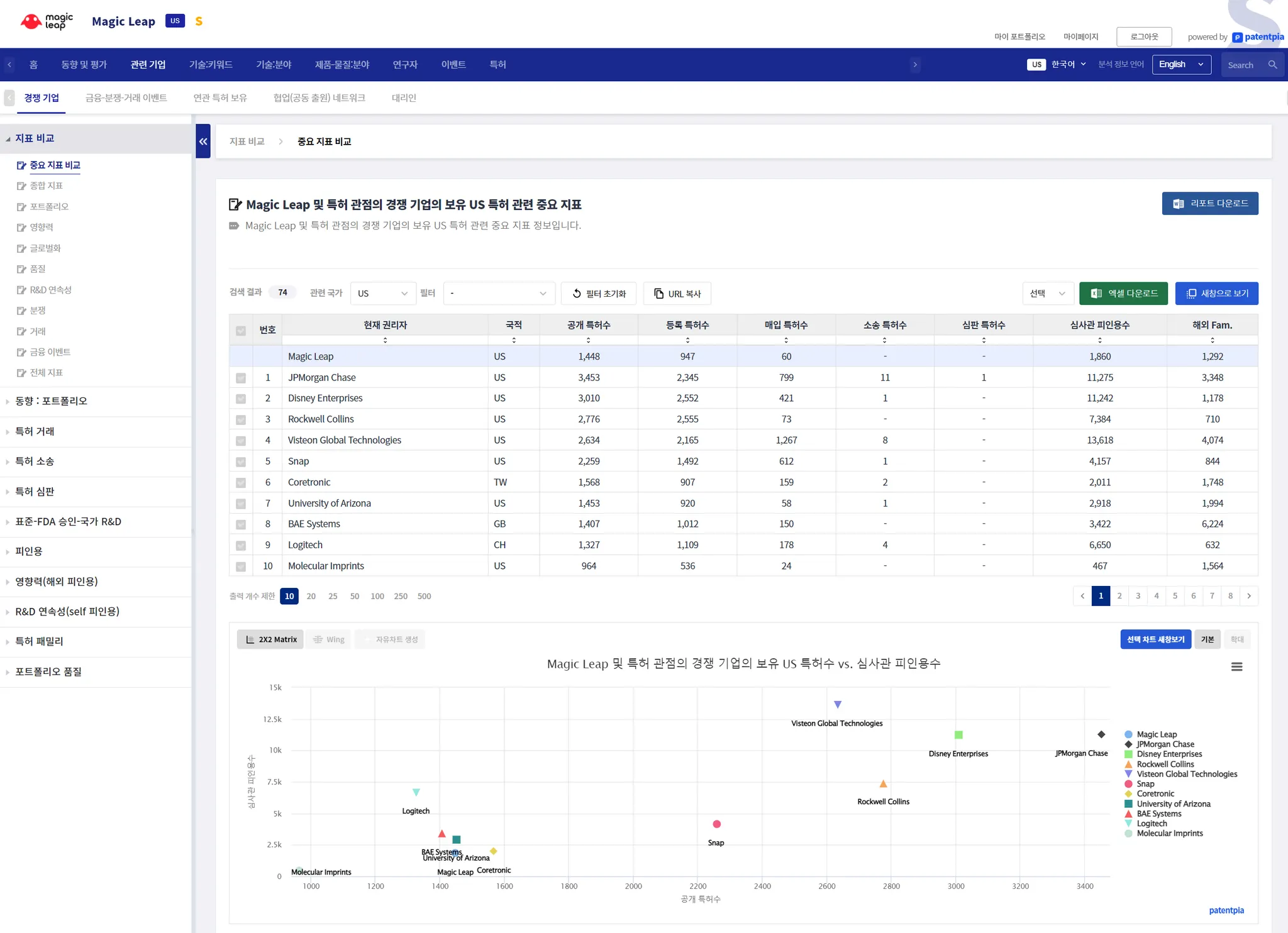 기업i vs. 경쟁 기업ij 간에 i) 포트폴리오, ii) 영향력, iii) 글로벌화, iv) 품질, v) R&D 연속성, vii 특허 거래(매입), vii) 소송, viii) 심판, vx) 표준/FDA 승인/국가 R&D 관점의 각종 세부적인 메트릭으로 비교 분석합니다.