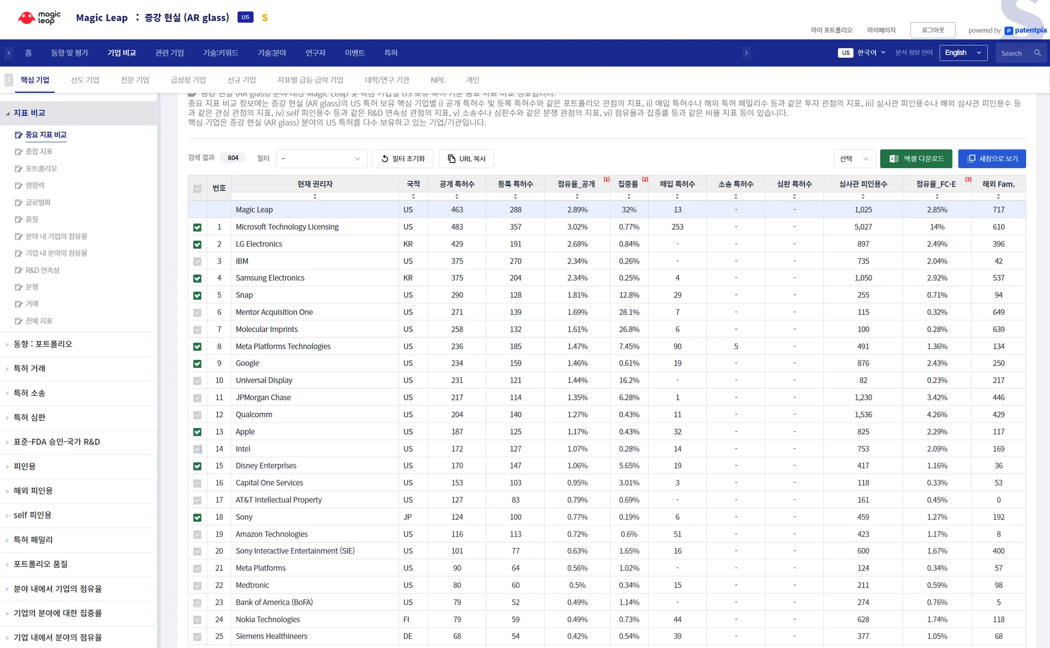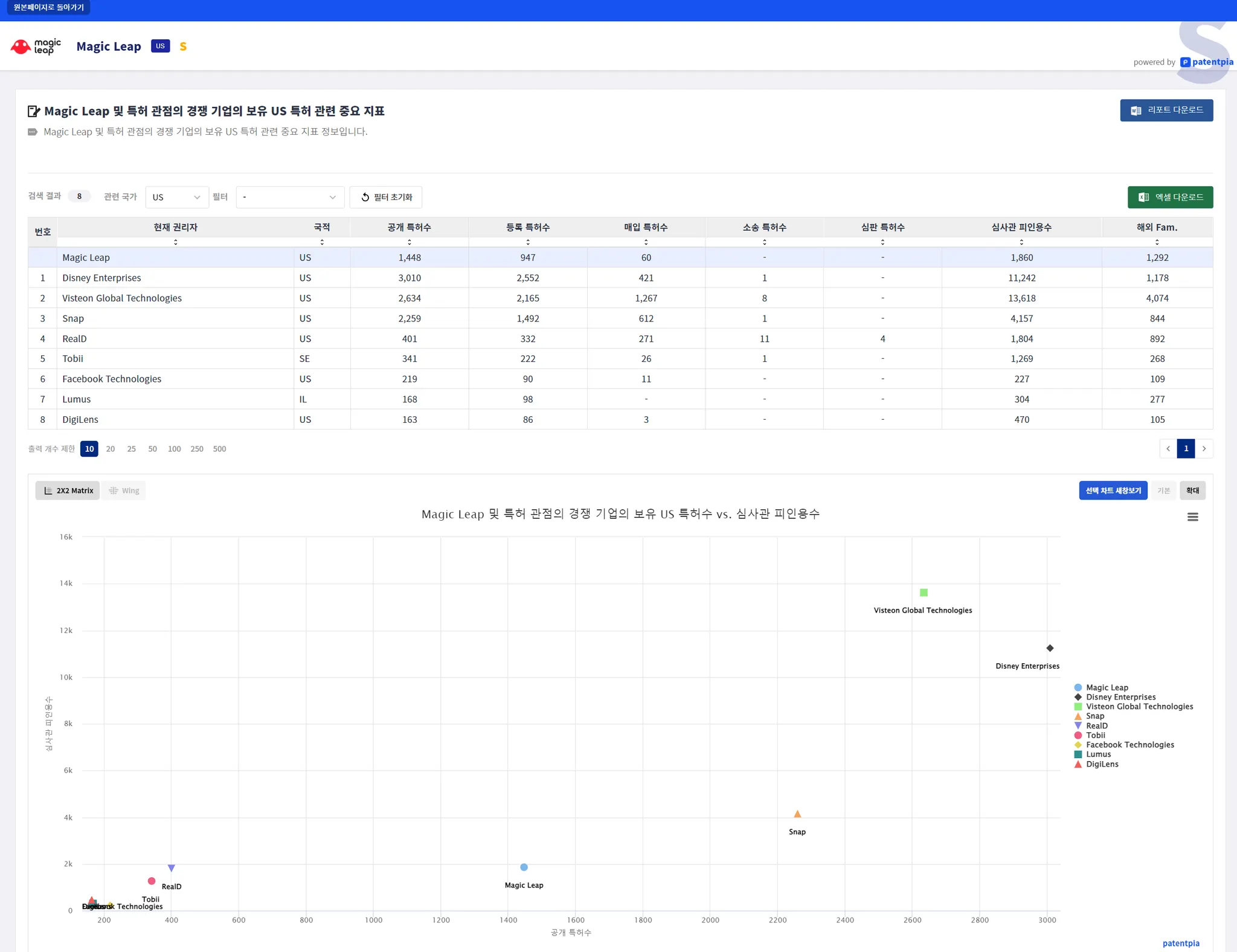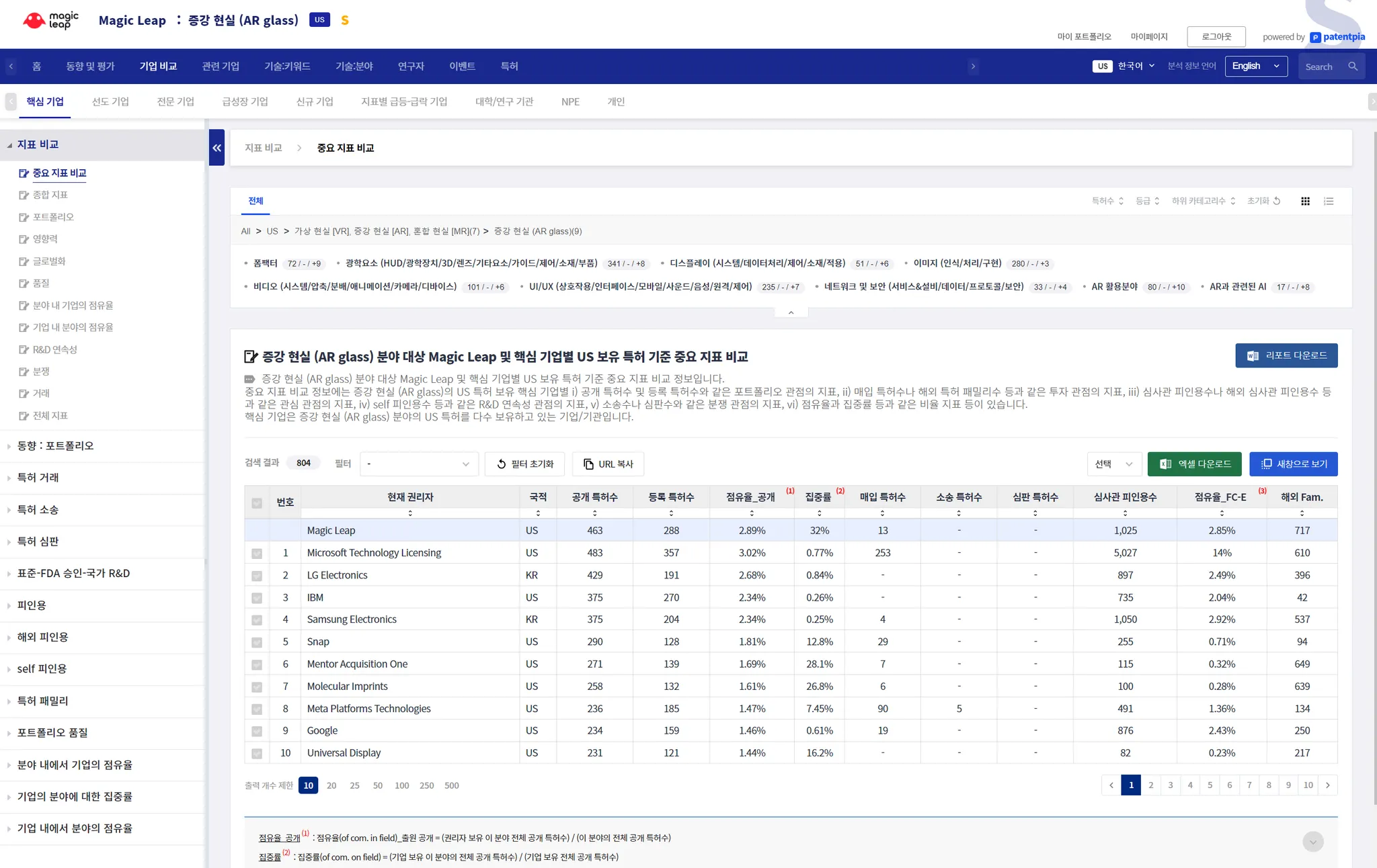 기업i vs. 경쟁 기업ij 간에 i) 포트폴리오, ii) 영향력, iii) 글로벌화, iv) 품질, v) R&D 연속성, vii 특허 거래(매입), vii) 소송, viii) 심판, vx) 표준/FDA 승인/국가 R&D 관점의 각종 세부적인 메트릭으로 비교 분석합니다.
