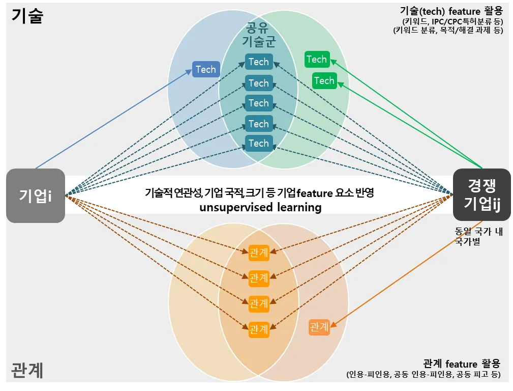 아울러, 기업i 및 기업j의 특허에 포함되어 있는 키워드셋의 유사성이 높을수록 기업i 및 기업j은 특허 관점의 경쟁 기업군이 됩니다.