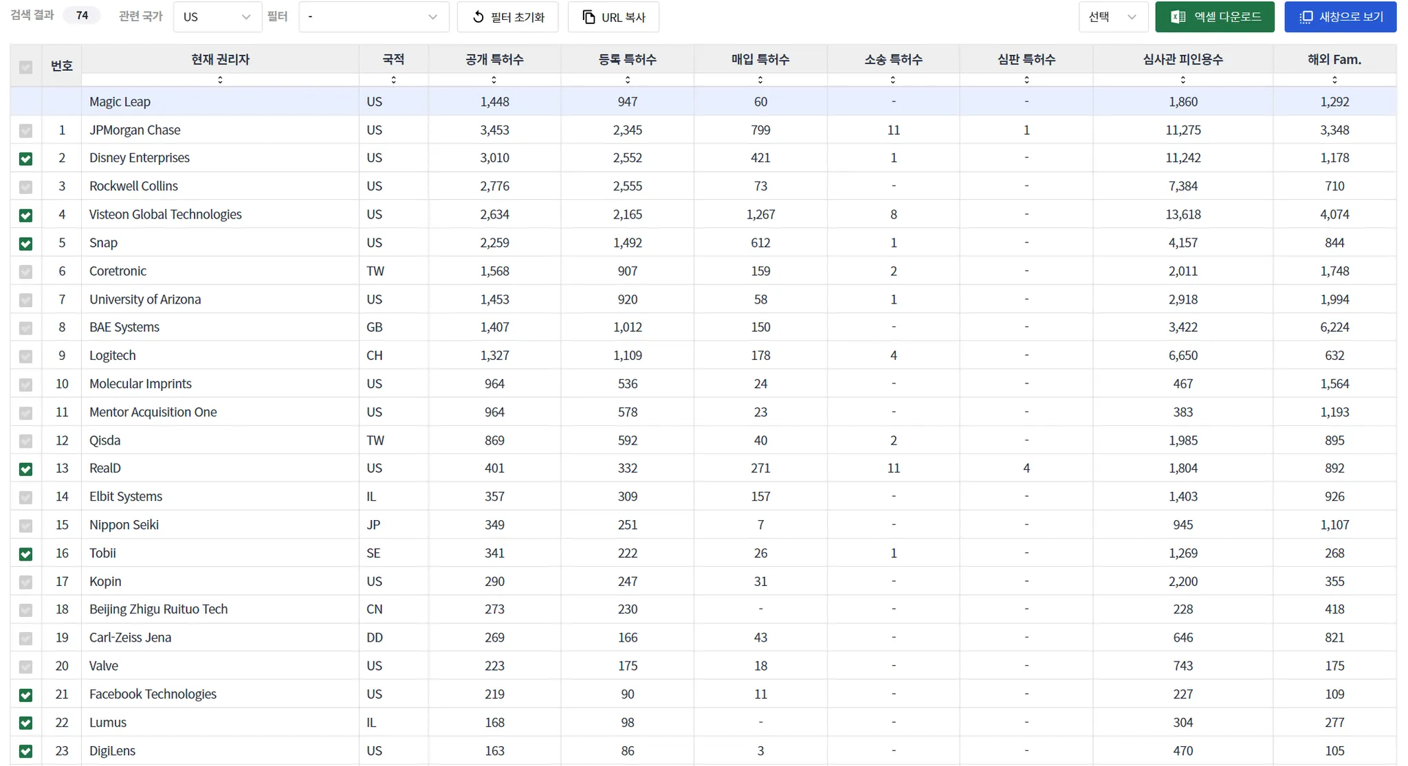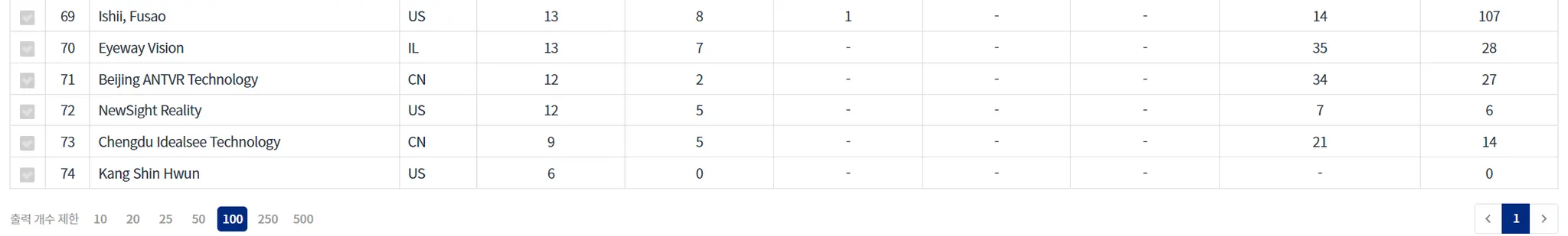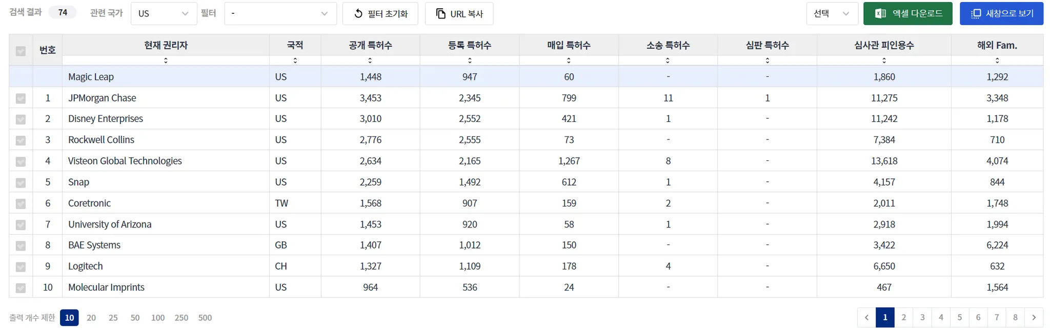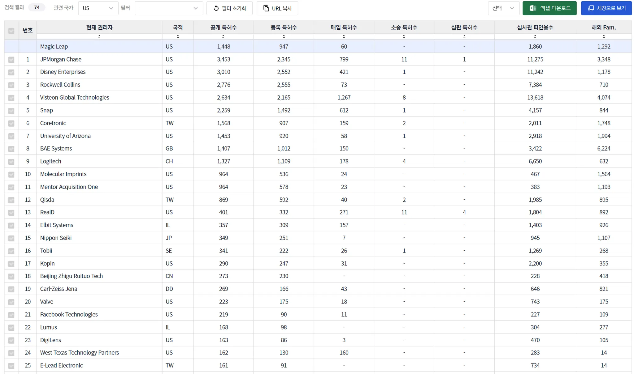 이때, PatentPia가 제시하는 Magic Leap와 특허 관점의 경쟁 기업이 74개가 있으므로,