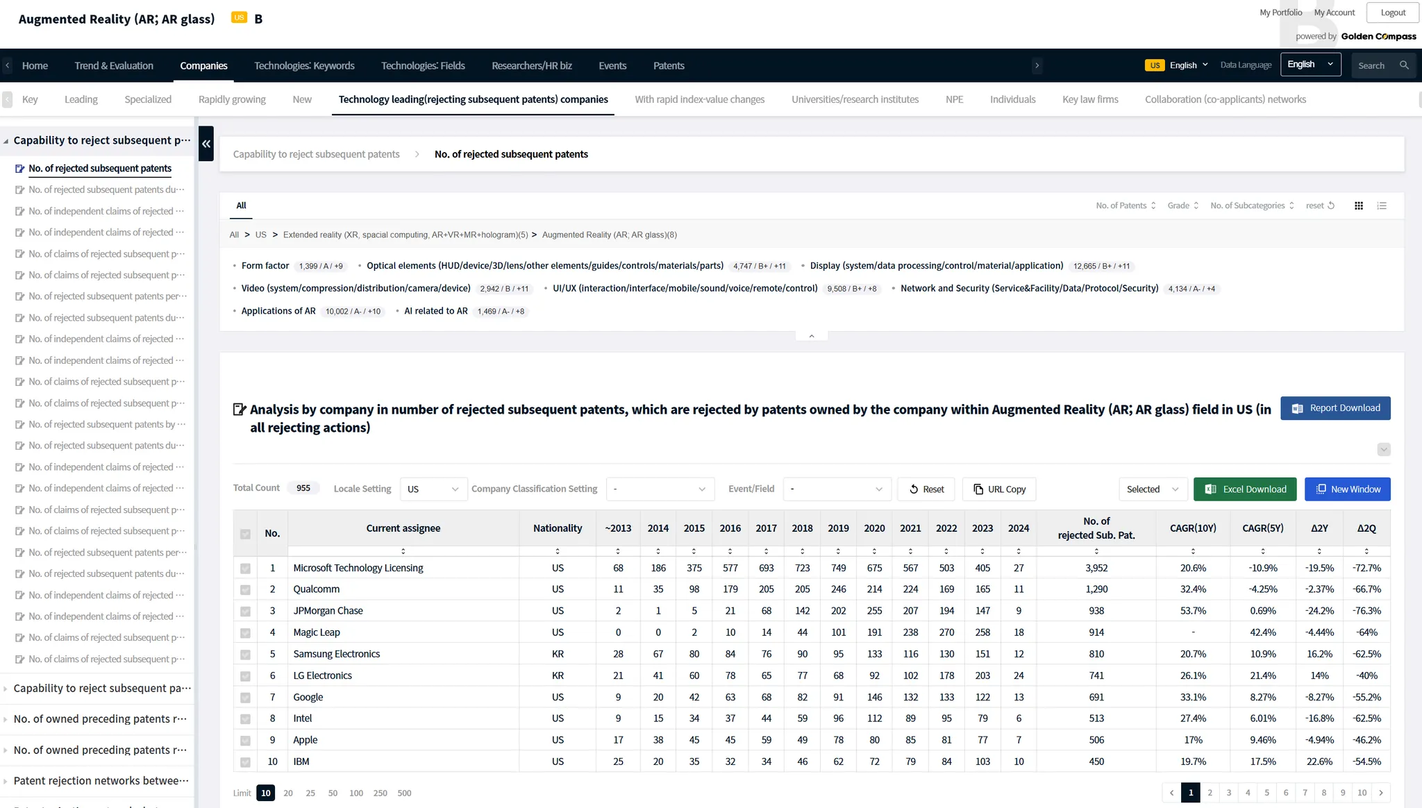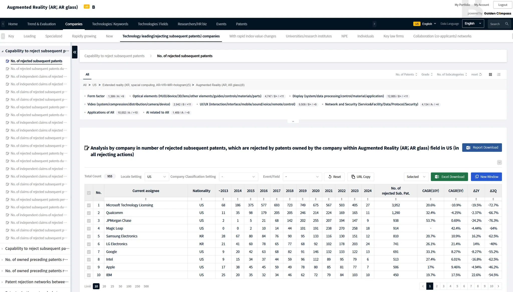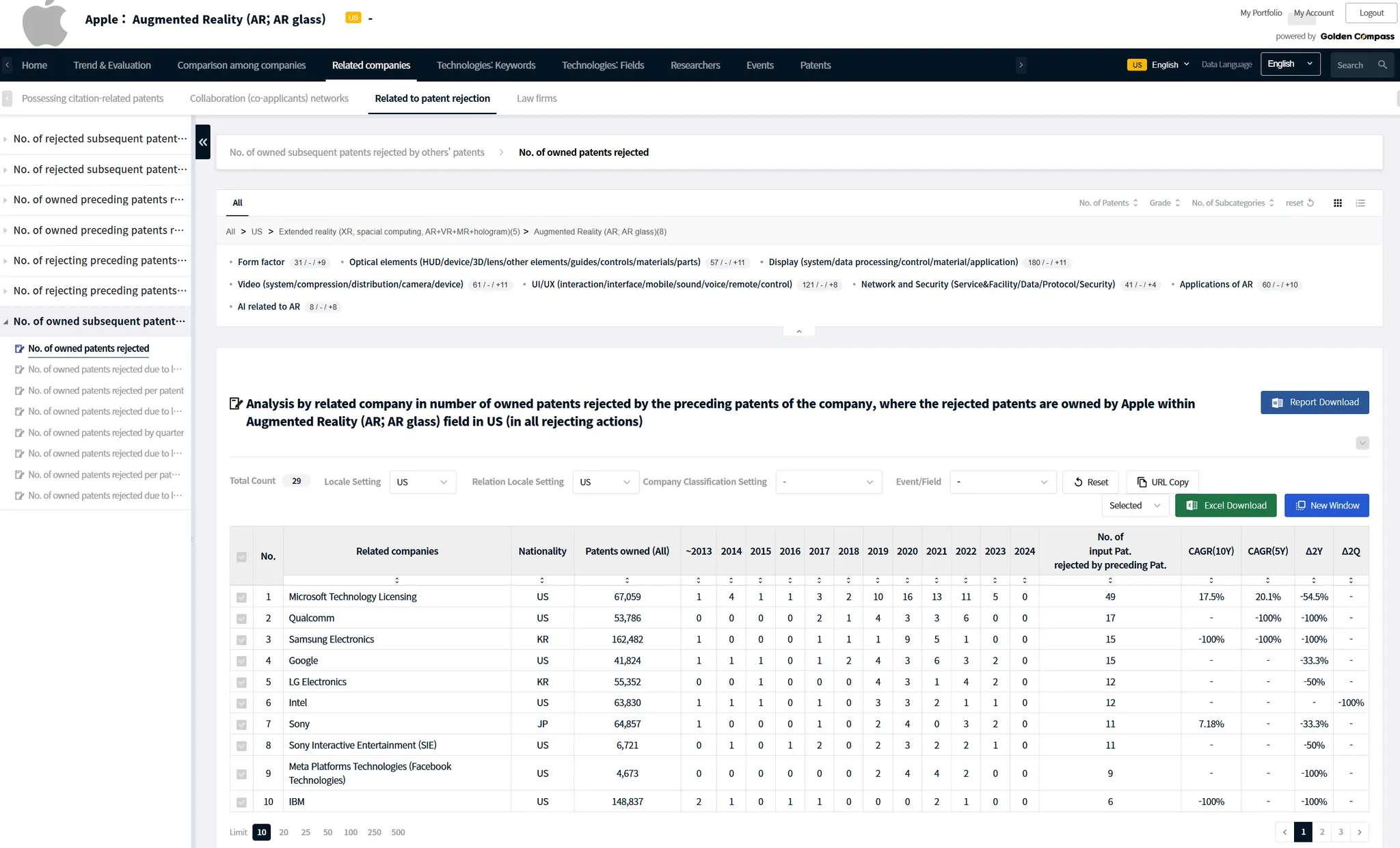 The example below is an analysis of the trend of No. of rejecting subsequent patents rejected by the United States of America patents in possession, among companies with patents related to field of Augmented Reality (AR; AR glass).
