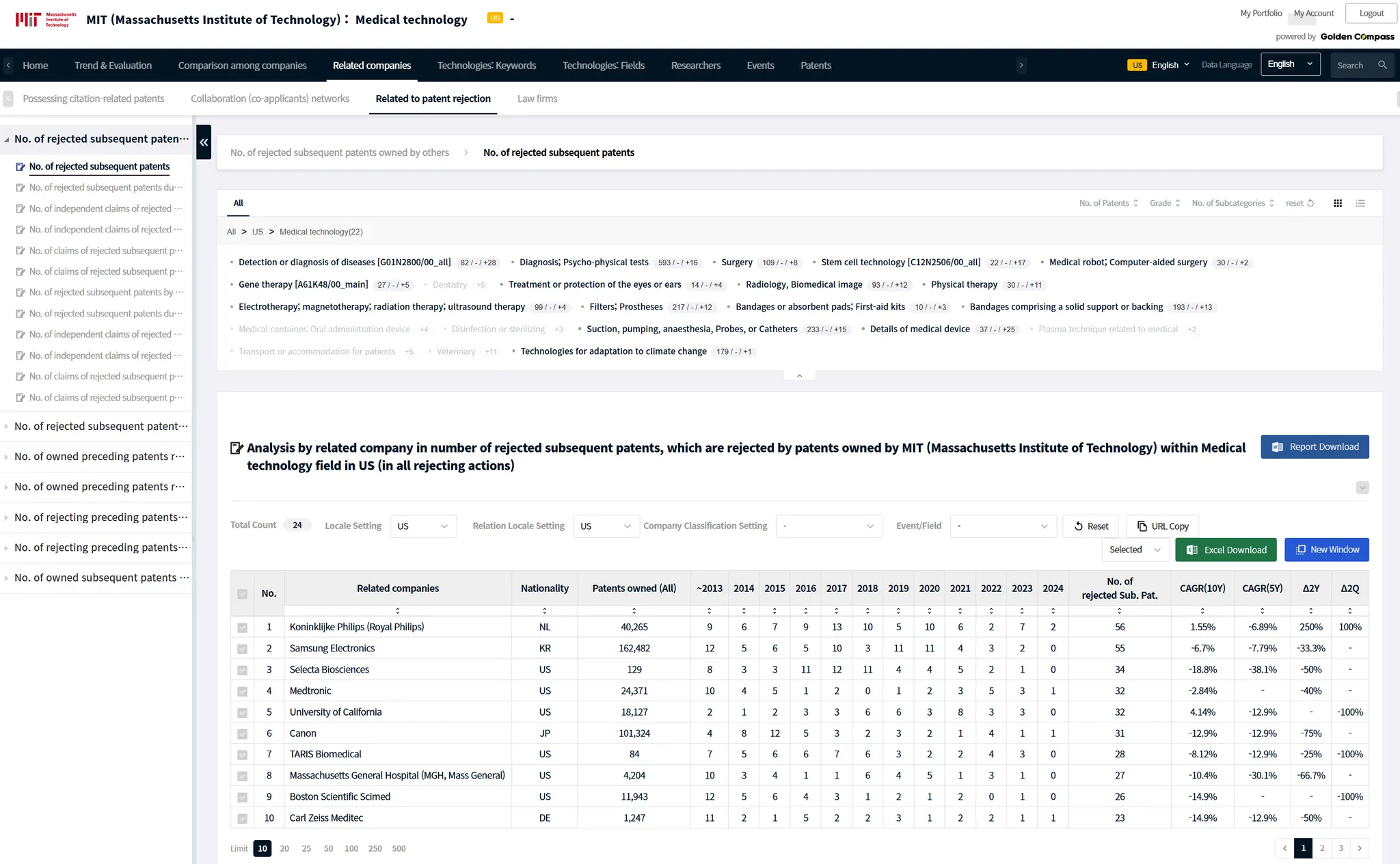 The example below is an analysis of companies rejecting subsequent patents rejected by patents in possession in the field of medical technology from MIT.
