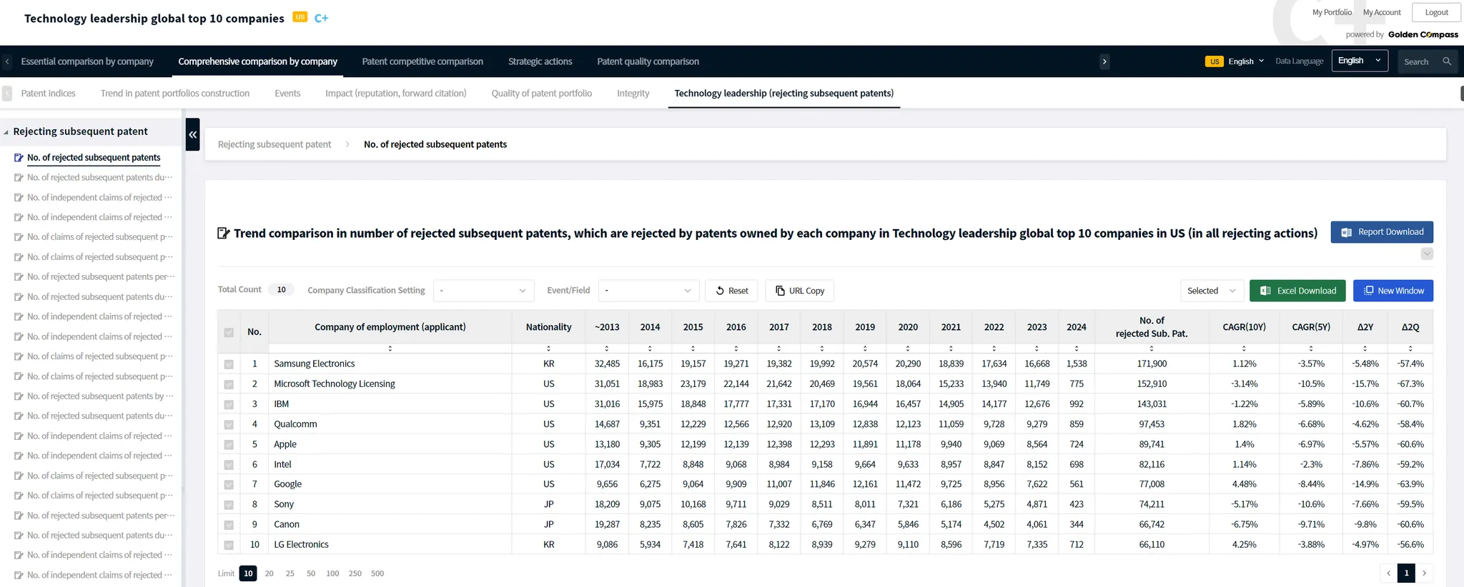 The example below is an analysis of the trend of No. of rejecting subsequent patents rejected by prior U.S. of America patents in possession among global top companies.