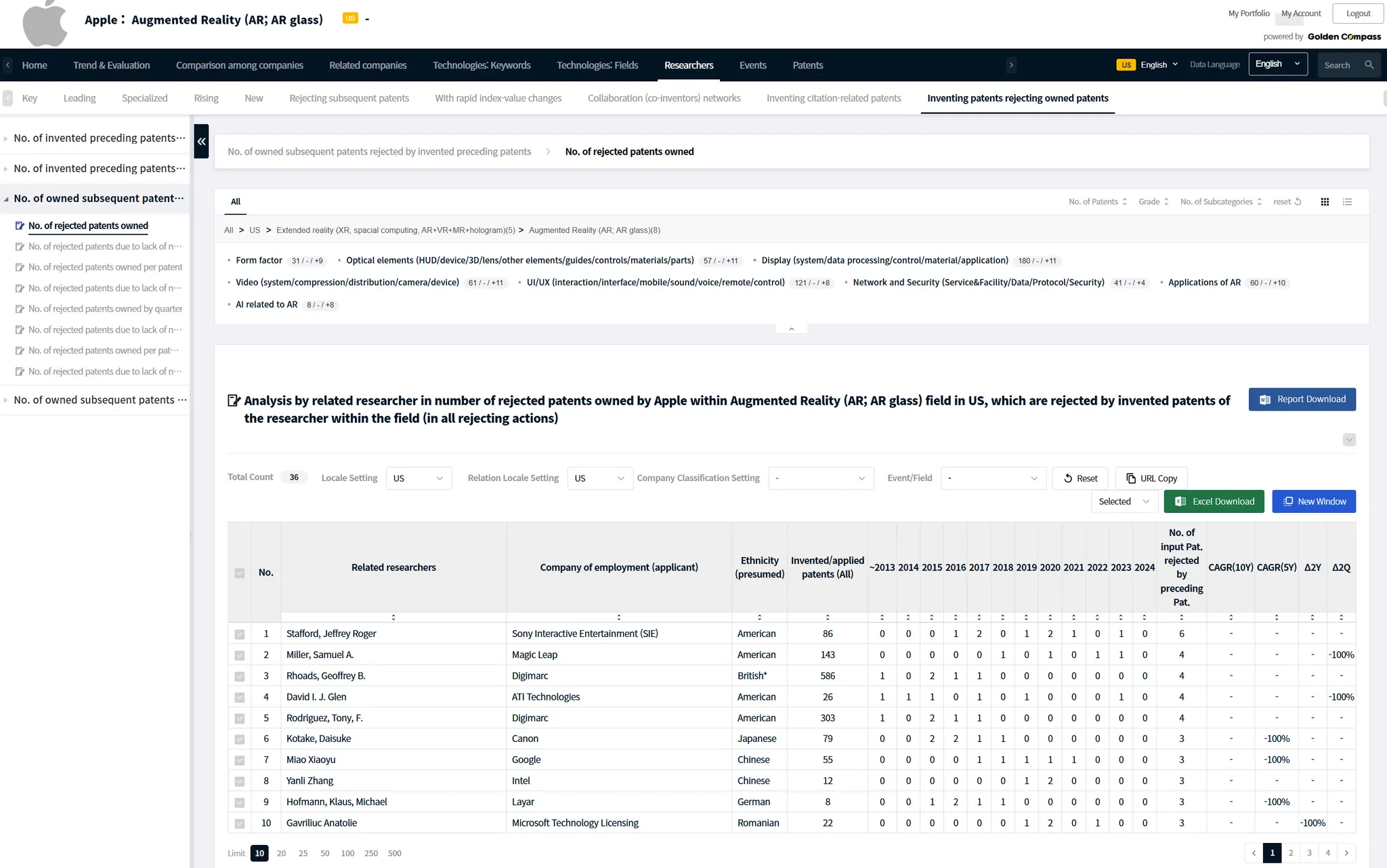 The example below is an analysis of an inventor whose preceding patents led to the rejection of Apple's patents related to field of ‘Augmented Reality (AR; AR glass)’. The data about researchers from the input company (e.g., Apple) can be utilized for internal HR tasks; and, the data about researchers not from the input company (e.g., Apple) can be utilized for HR/Recruiting businesses.