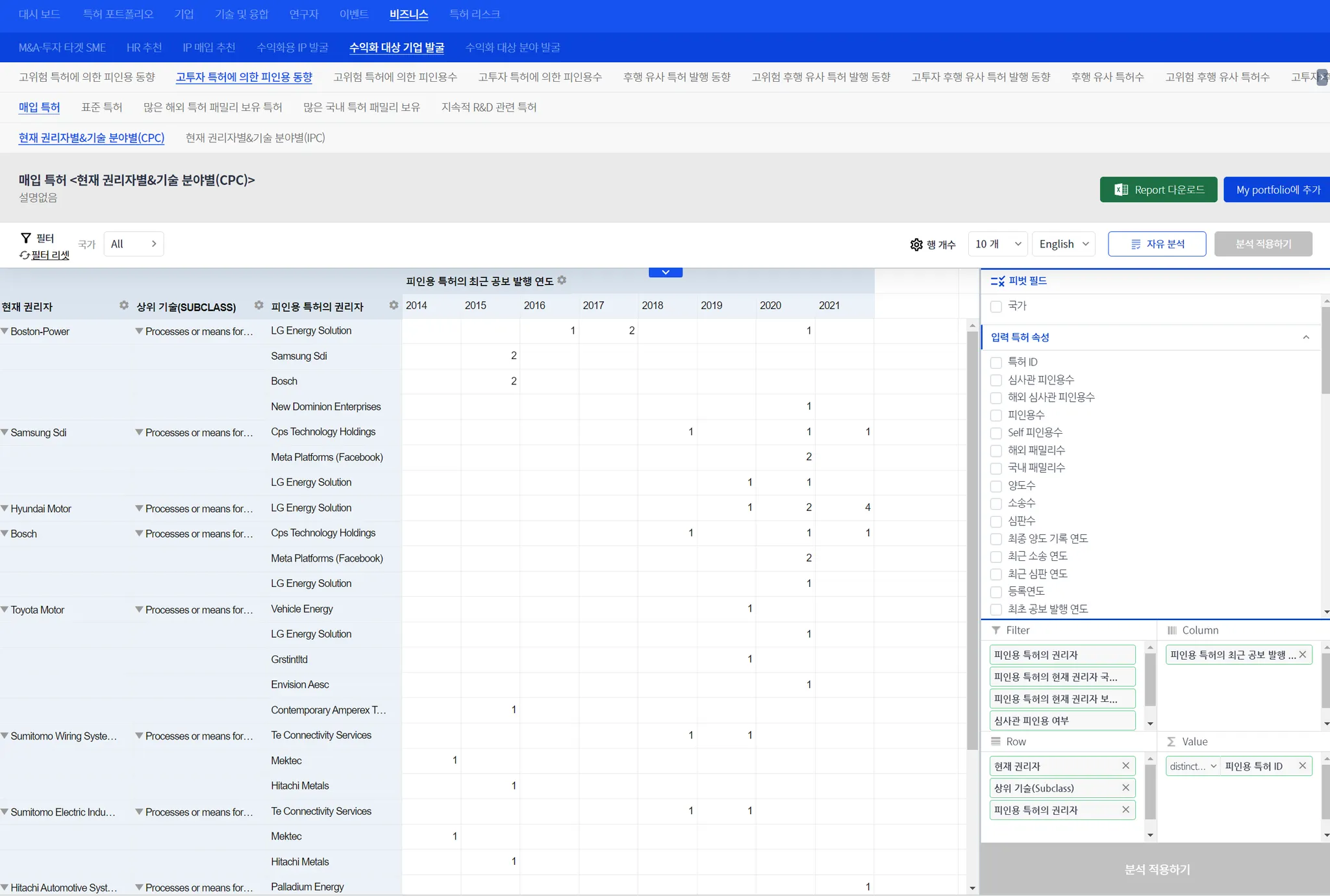 ii) 특정 분야에서 피인용 총량, 피인용 급증, 또는 특허당 피인용을 많이 받은 기업 등을 대상으로 한 M&A/투자/협업 대상 기업 발굴,