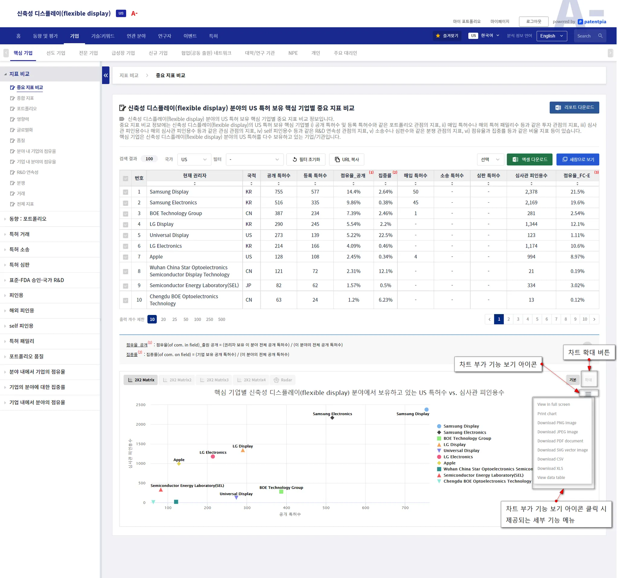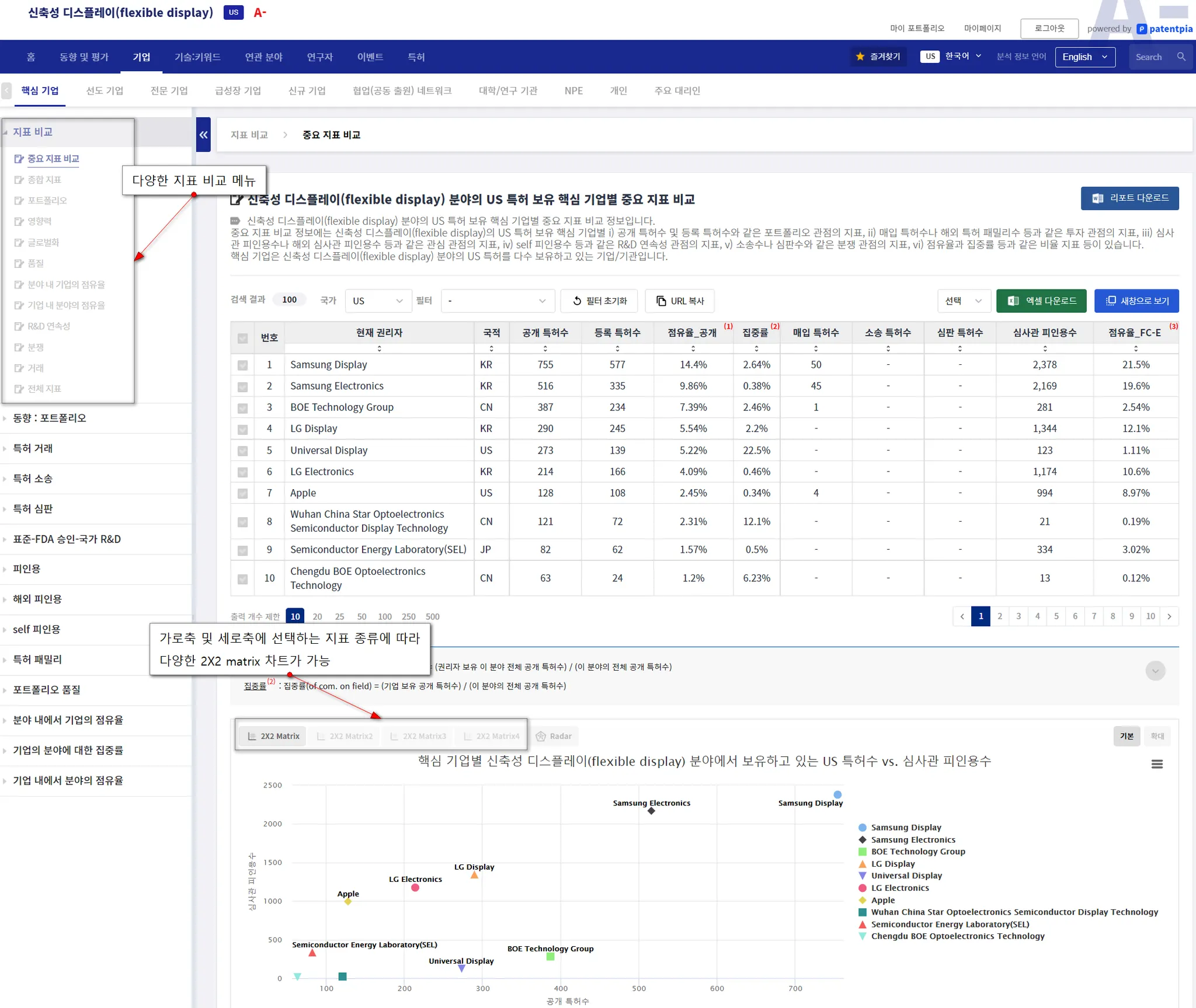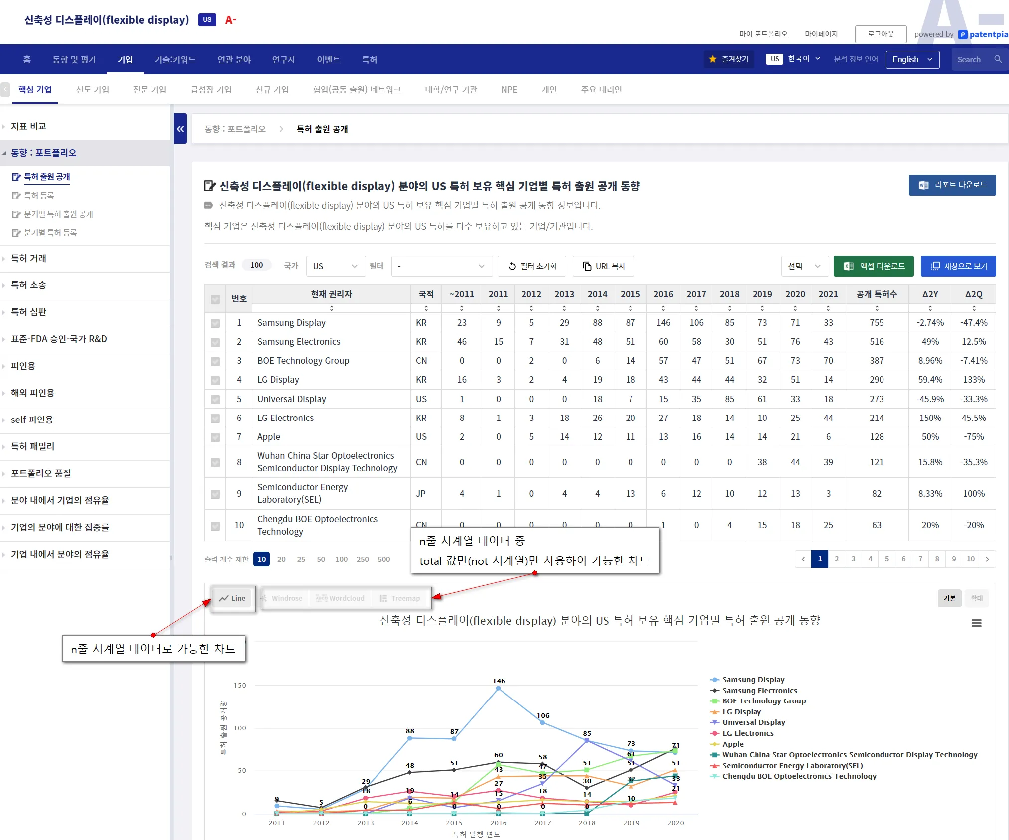 Apple을 관심 기업으로, Apple의 flexible display를 Apple의 관심 키워드 예시로, PatentPia GoldenCompass를 활용한 차트 콘텐츠를 제공합니다. 위 활용 지도의 각 항목에 결합되어 있는 사슬(링크) 표시를 클릭하면, 예시 화면이 새 창으로 열립니다.