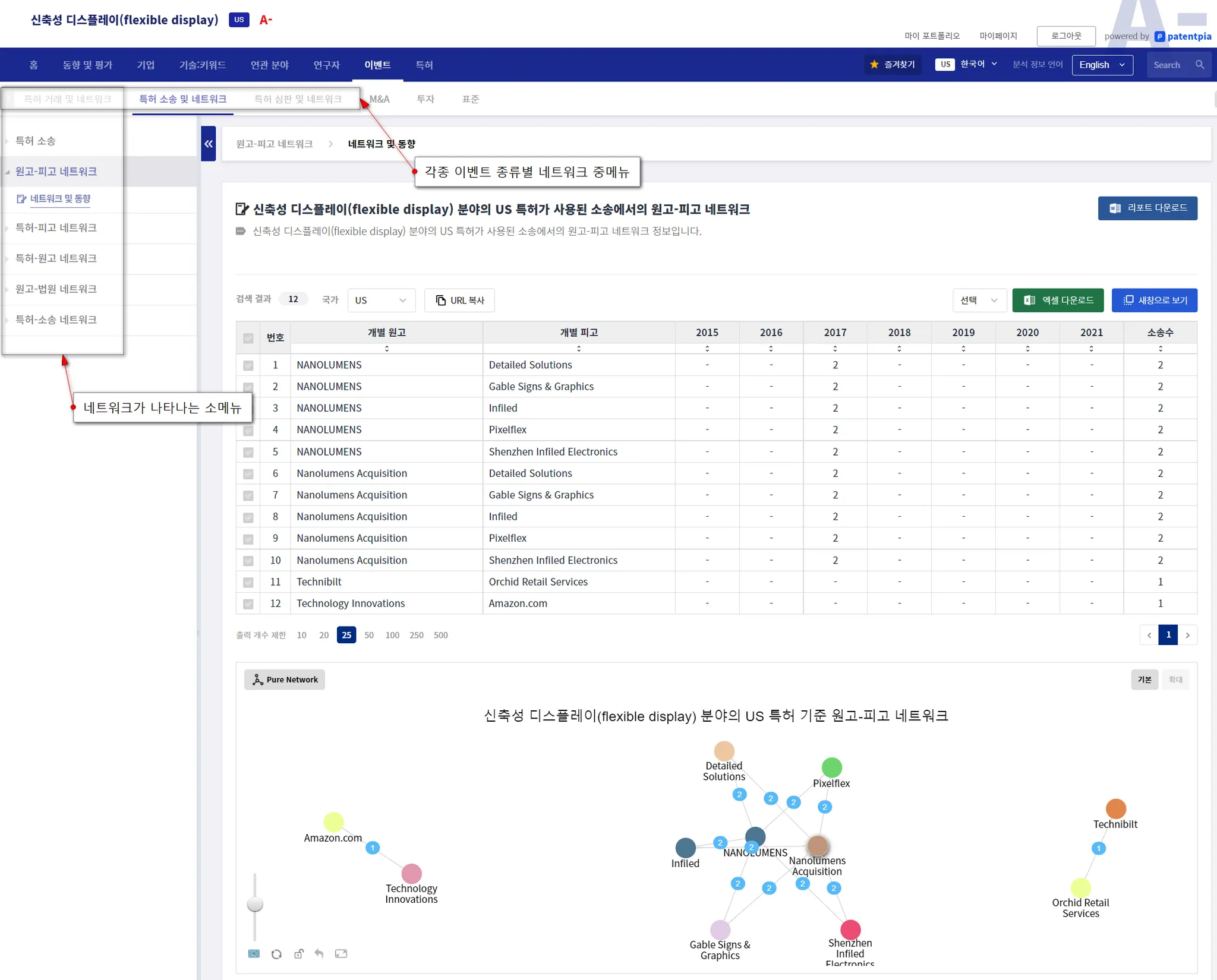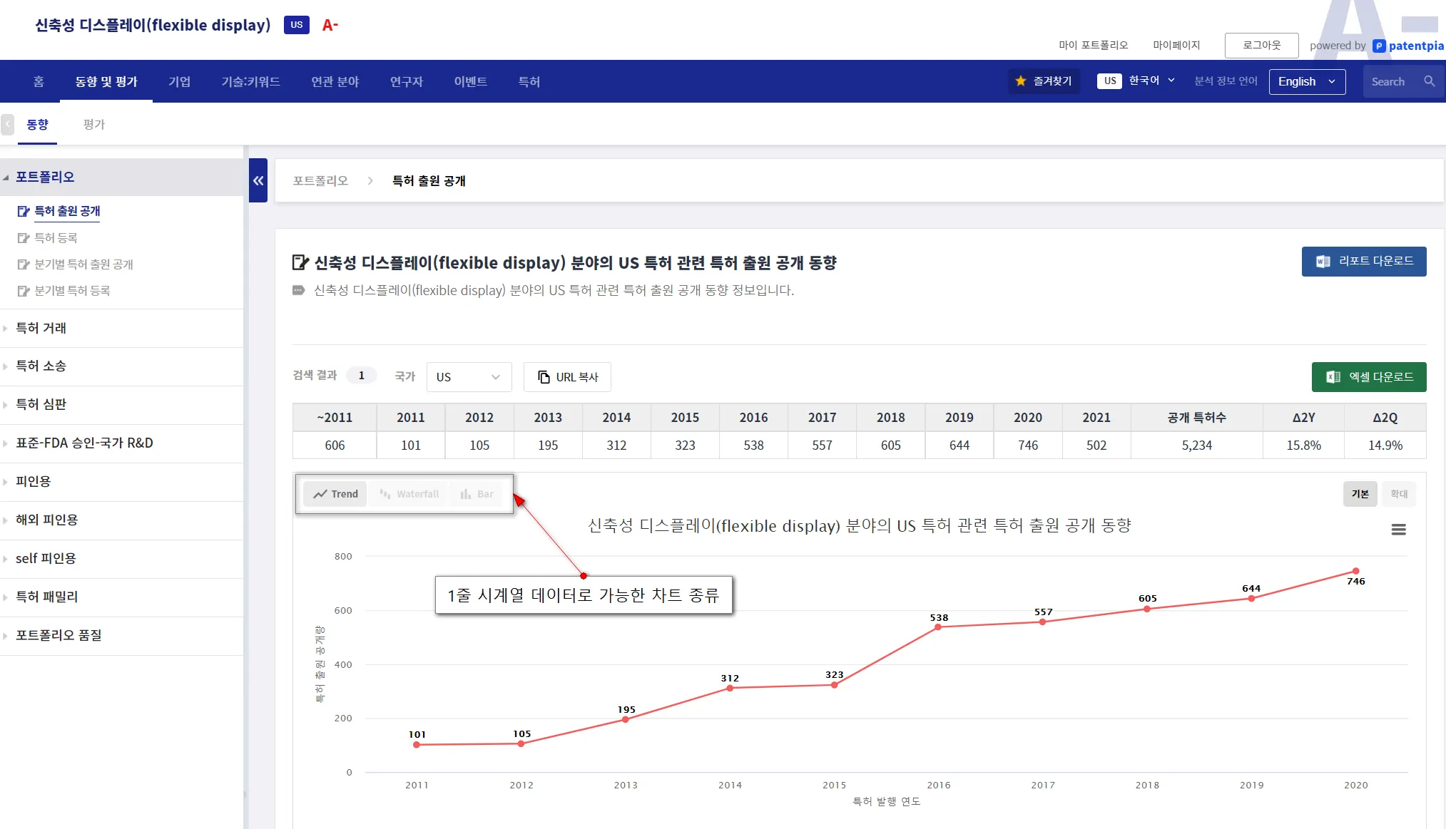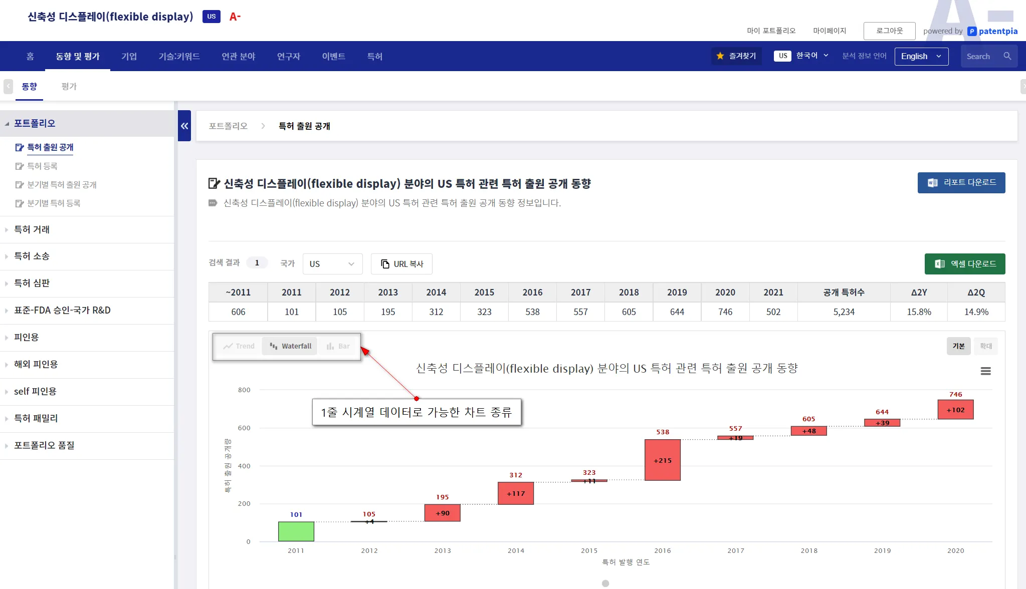 Apple을 관심 기업으로, Apple의 flexible display를 Apple의 관심 키워드 예시로, PatentPia GoldenCompass를 활용한 차트 콘텐츠를 제공합니다. 위 활용 지도의 각 항목에 결합되어 있는 사슬(링크) 표시를 클릭하면, 예시 화면이 새 창으로 열립니다.