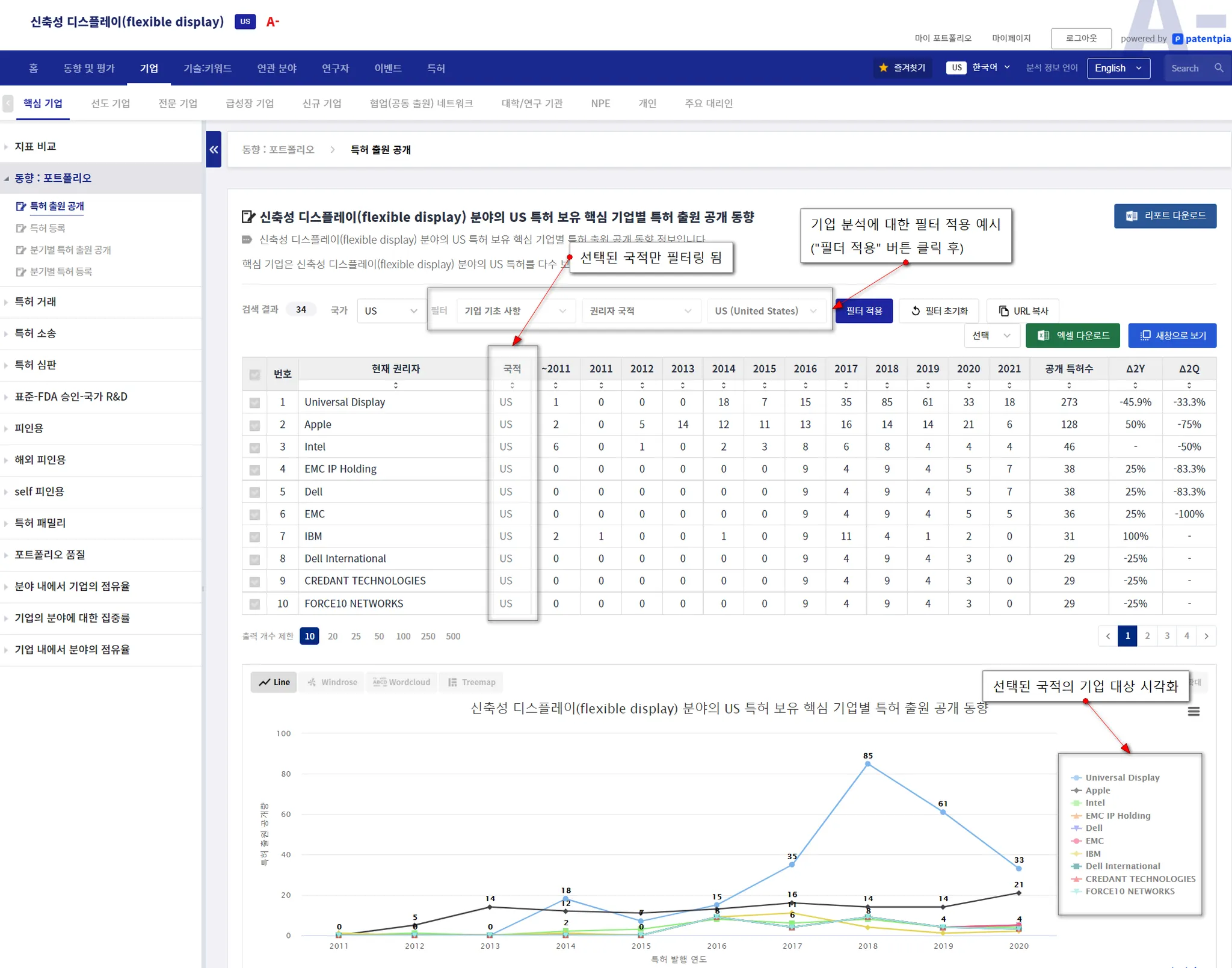 기업 분석 화면에서, 필터 → 기업 기초 사항 → 권리자 국적 → 나열된 국적 중 1개 선택(예, United States) → "필터 적용" 버튼 클릭의 순서로 입력하면, 선택된 국적을 기준으로 필터링이 적용됩니다.