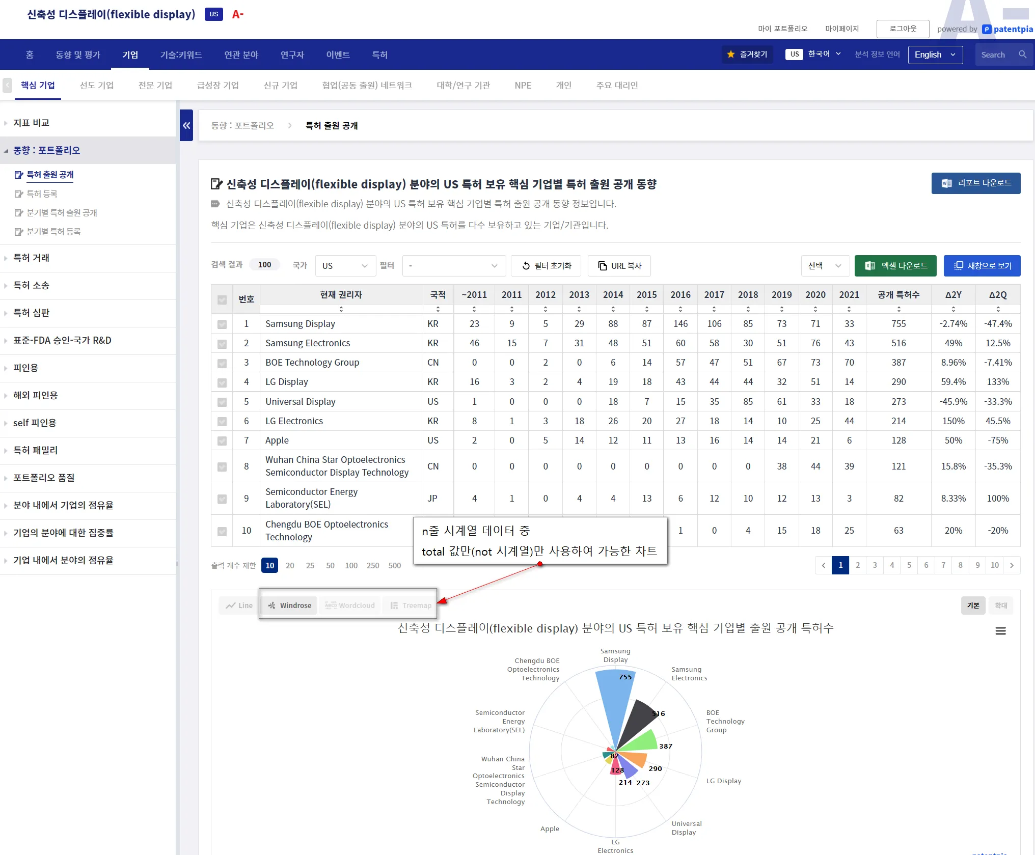 변경된 분석 결과에 따라, 차트 등에서도 선택된 국적의 기업만이 나타납니다. 아울러, 리포트 등도 선택된 국적의 기업만으로 구성됩니다.