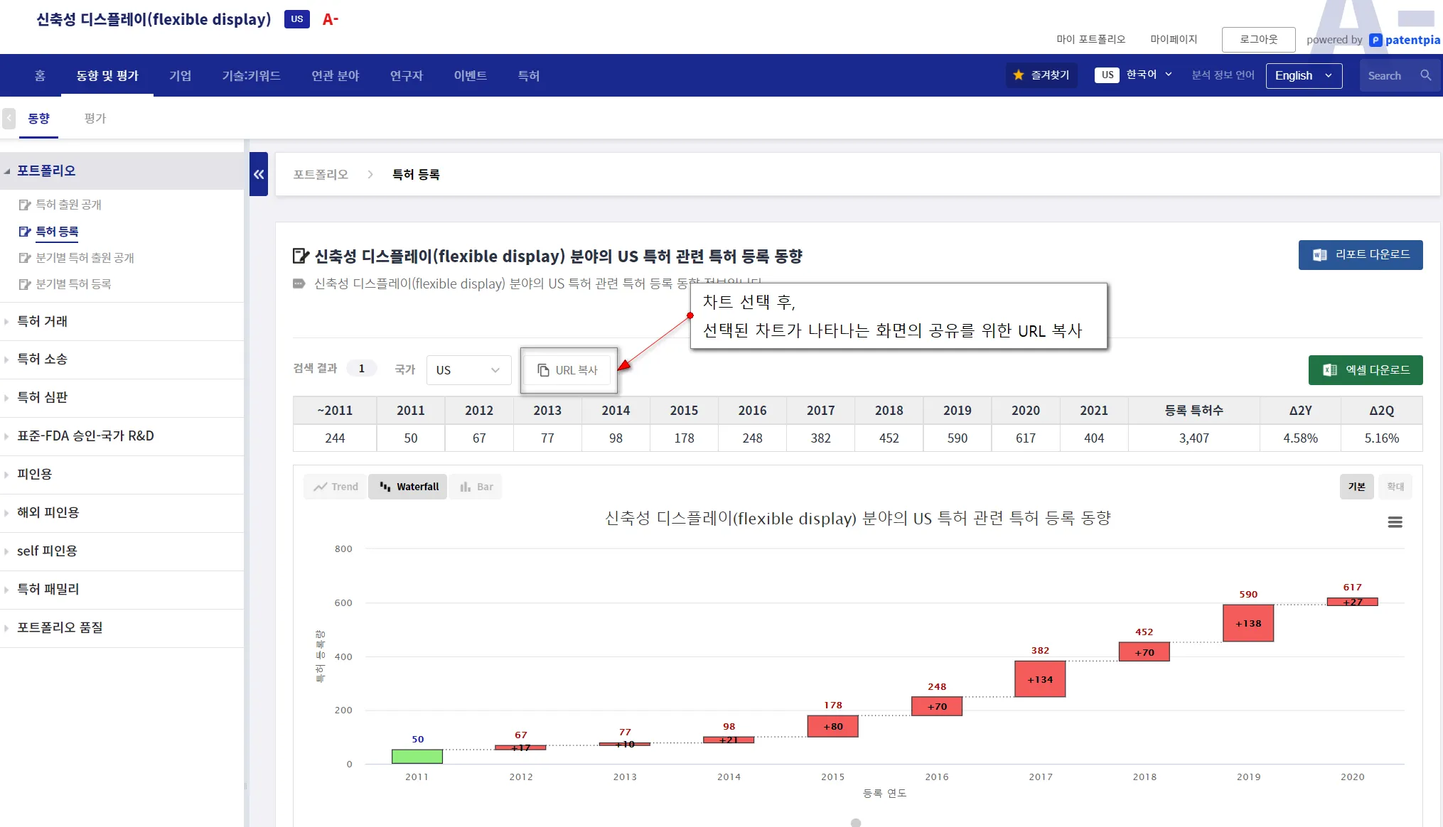 분석 결과 화면에 나타나는 다양한 차트 중에서, 자신이 공유하기를 원하는 차트를 선택한 다음, "URL 복사"를 클릭합니다. 클립보드에는 waterfall 차트가 나타나는 URL이 복사되어 있습니다. 이 URL을 공유하거나, 콘텐츠에 하이퍼링크를 걸면, waterfall 차트가 나타나는 분석 화면이 재현됩니다. 만약, 웹 페이지 주소 창의 URL을 복사한 다음, 이를 공유하거나, 콘텐츠에 하이퍼링크를 걸면, waterfall 차트가 아닌, 맨 앞에 있는 default 차트인 trend 차트가 나타나는 분석 화면이 재현됩니다.