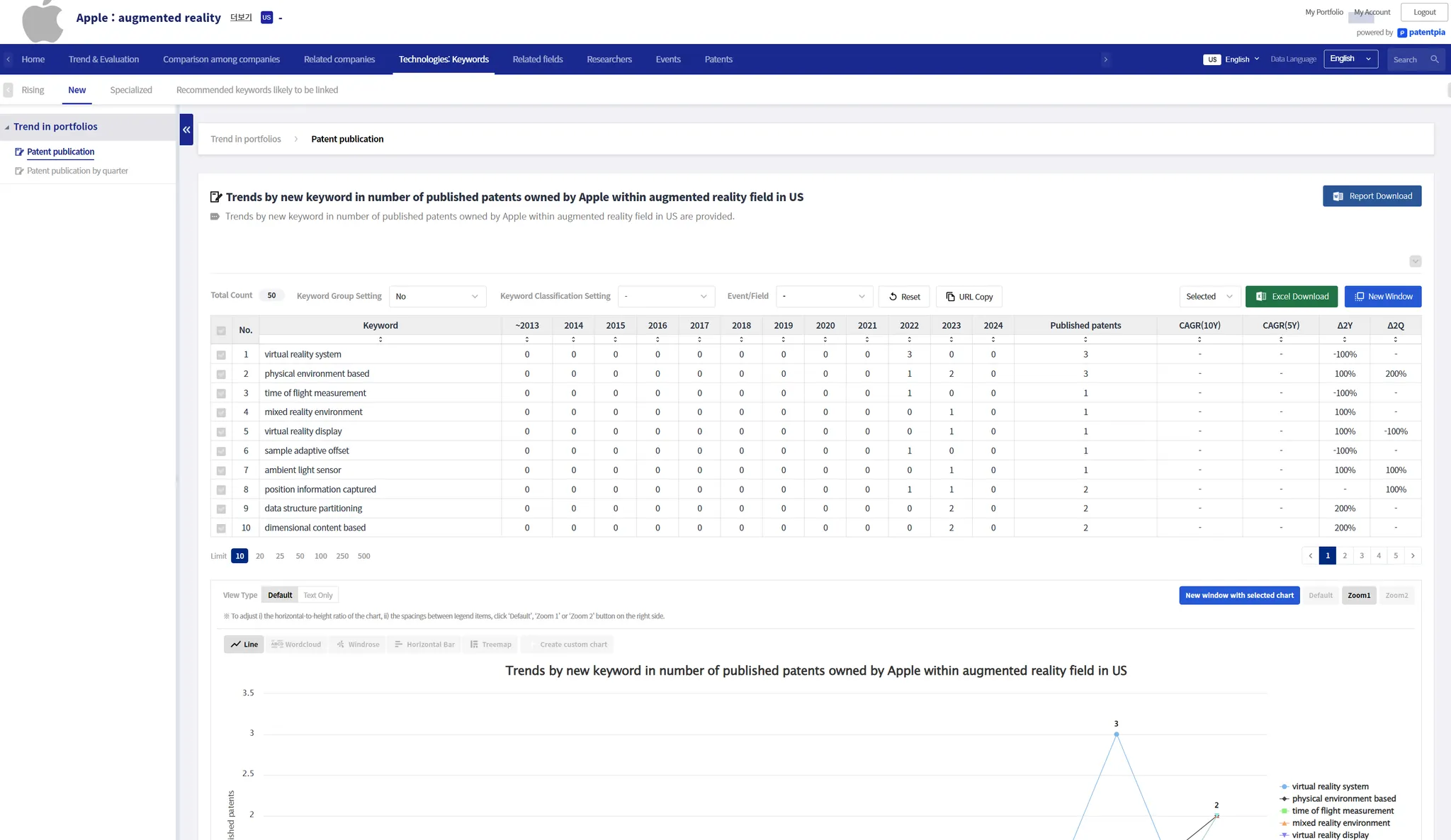 We provide technology trend contents using PatentPia GoldenCompass as an example of augmented reality technology keywords, Apple as an example of a company, and Augmented Reality (AR; AR glass) as an example of a field with a hierarchy. If you click on the chain(link) marks that are attached to each item in the utilization map above, the example page will open in a new window.