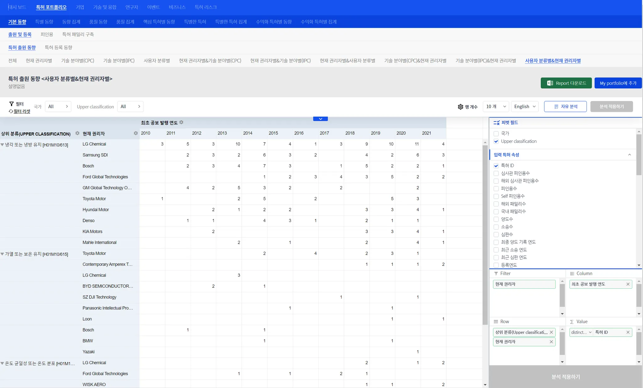 아래는 입력된 특허셋에 대하여, “특허 포트폴리오 → 기본 동향 → 출원 및 등록 → 특허 출원 동향 → 사용자 분류별&현재 권리자별”을 선택했을 때 나타나는 특허 분석 결과입니다.
