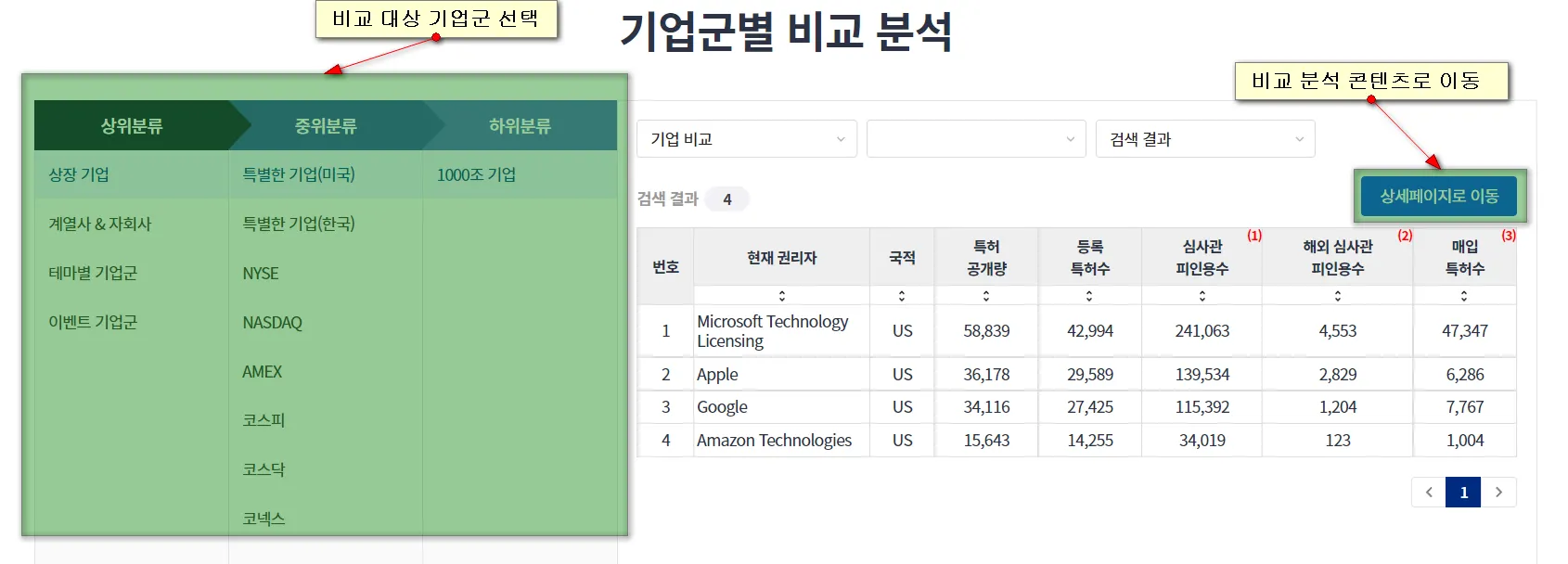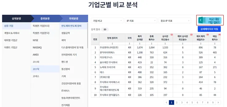 선택된 기업들을 대상으로 비교 분석할 메뉴를 선택합니다. 비교 대상이 되는 국가(특허청)를 선택할 필요가 있습니다.