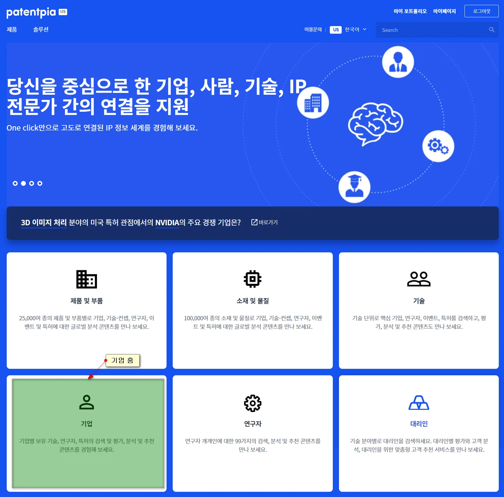 기업 홈은 PatentPia GoldenCompass main 화면에 있습니다.
