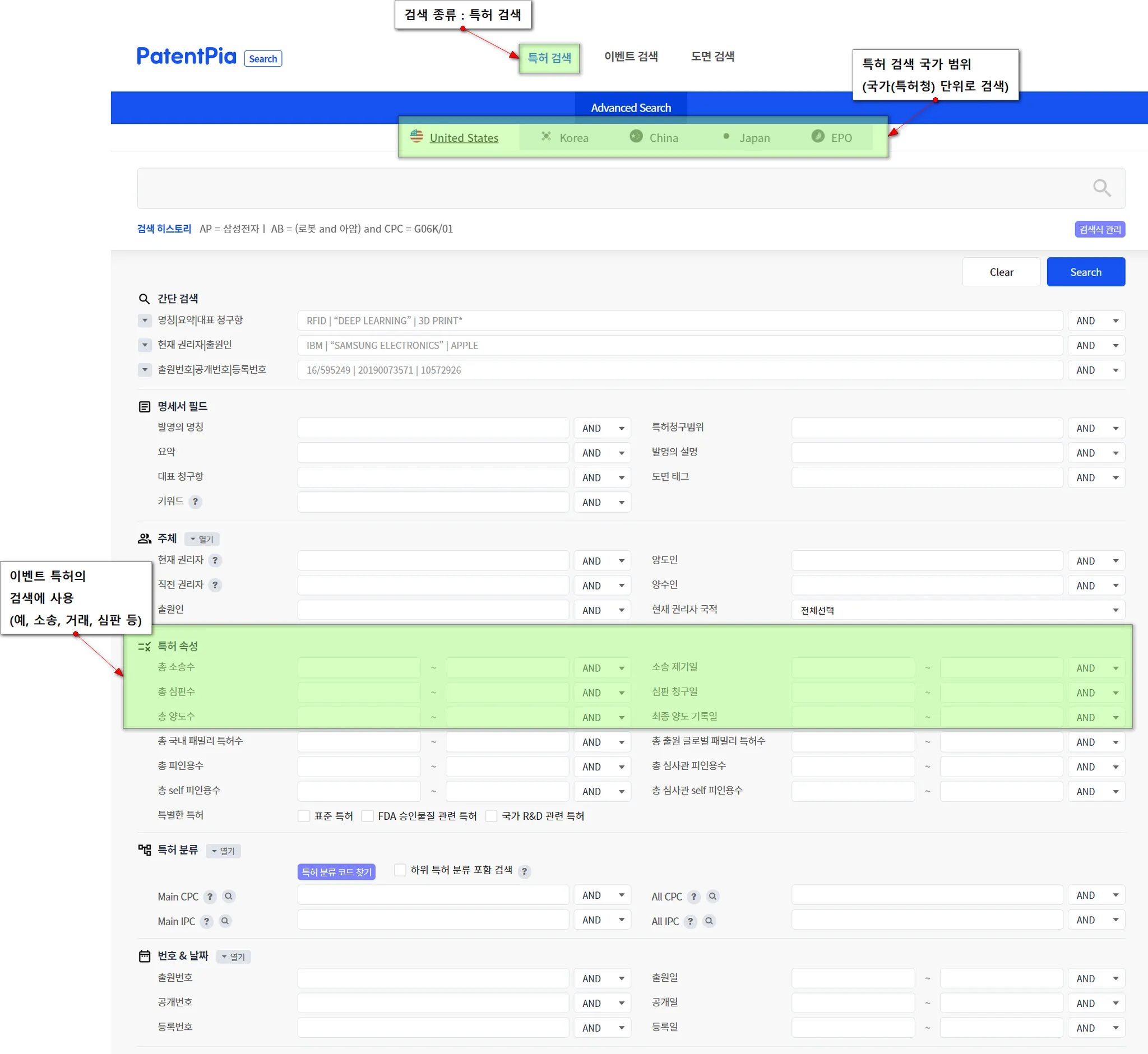 특허 검색 UI에 포함되어 있는 다양한 검색 필드를 복합적으로 활용하면, 이벤트 특허에 대한 정교한 검색 결과를 획득할 수 있습니다.
