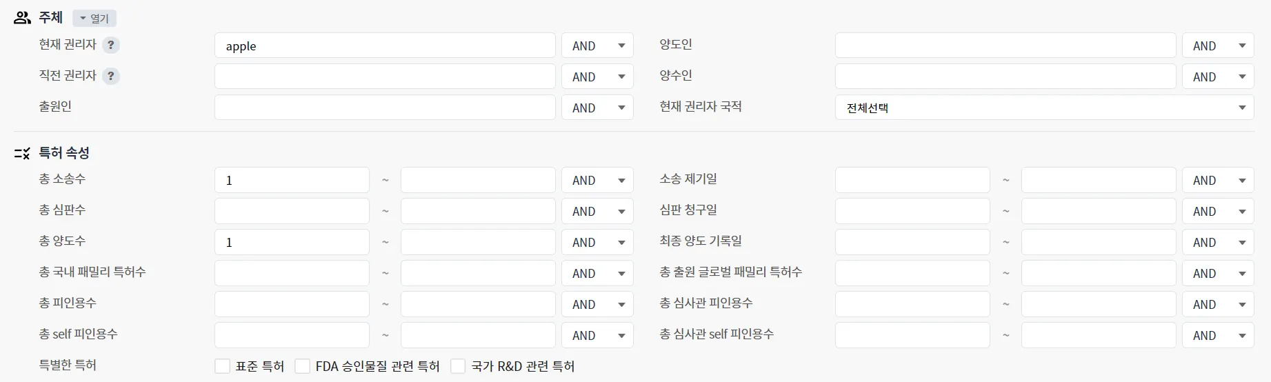 PatentPia Search의 모든 검색 필드 간에는 “AND”, “OR”, “NOT” 등의 논리 연산자가 적용됩니다. 따라서, 다른 검색 필드와 “특허 속성” 필드를 함께 사용하면, 더욱 더 정교한 특허 검색이 가능해 집니다.