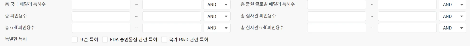 “심사관 피인용수” 등과 같은 “특허 속성” 필드를 사용하면, 심사관 피인용수가 일정 개수 이상인 특허만을 검색할 수 있습니다.